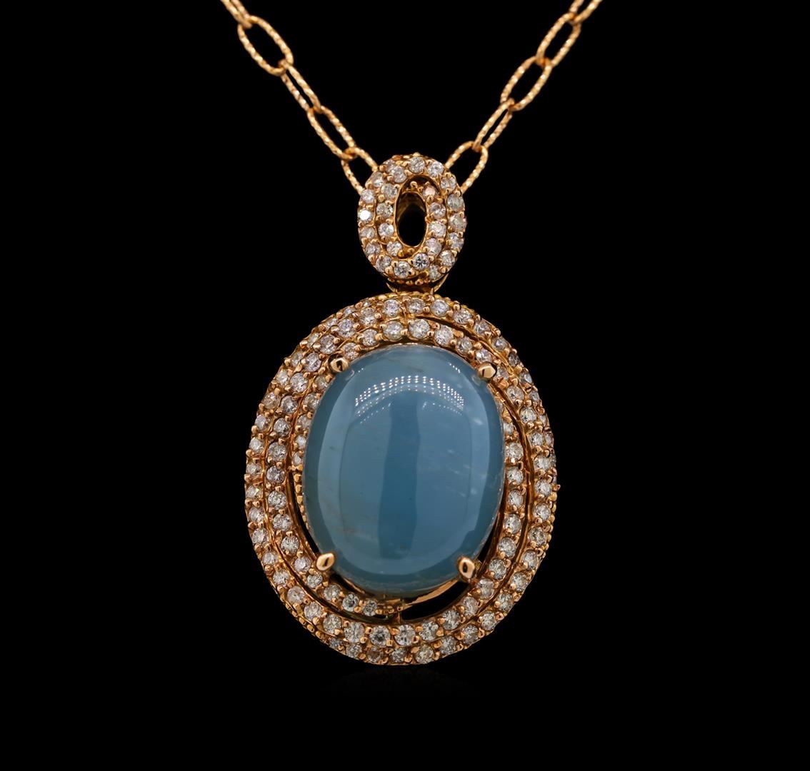 One electronically tested 14KT rose gold ladies combination cast & assembled chrysoprase and diamond pendant & chain 18.0" long, oval cable link with a lobster claw clasp with a bright polish finish. Identified with markings of "14K". Condition is new. Containing: One Hundred Eighteen prong set round brilliant cut diamonds, measuring 1.30 - 1.30 x 0.78mm (depth est.) approximate total weight of 118 Stones = 0.94ct. Clarity of SI-1 to I-1, Color of I - J, Cut is Good. One prong set oval cabochon cut natural chrysoprase, measuring 17.00 x 13.60 x 8.84mm, approximate weight of 14.35ct., clarity is heavily included, light, very slightly grayish, blue color, (GIA B 3/3), cut is good. All diamonds and colored gemstones are graded in the mounting, unless otherwise stated. Colored gemstones are presumed to have been subjected to commonly used enhancement processes. Total eight of Colored Stones 14.35ct. Total Weight of Diamonds 0.94ct. Total Weight of Pendant & Chain 12.70 grams. GGL Appraised at $4,650.00.