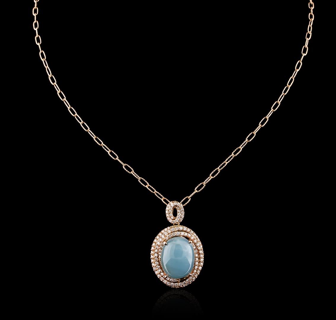 One electronically tested 14KT rose gold ladies combination cast & assembled chrysoprase and diamond pendant & chain 18.0" long, oval cable link with a lobster claw clasp with a bright polish finish. Identified with markings of "14K". Condition is new. Containing: One Hundred Eighteen prong set round brilliant cut diamonds, measuring 1.30 - 1.30 x 0.78mm (depth est.) approximate total weight of 118 Stones = 0.94ct. Clarity of SI-1 to I-1, Color of I - J, Cut is Good. One prong set oval cabochon cut natural chrysoprase, measuring 17.00 x 13.60 x 8.84mm, approximate weight of 14.35ct., clarity is heavily included, light, very slightly grayish, blue color, (GIA B 3/3), cut is good. All diamonds and colored gemstones are graded in the mounting, unless otherwise stated. Colored gemstones are presumed to have been subjected to commonly used enhancement processes. Total eight of Colored Stones 14.35ct. Total Weight of Diamonds 0.94ct. Total Weight of Pendant & Chain 12.70 grams. GGL Appraised at $4,650.00.