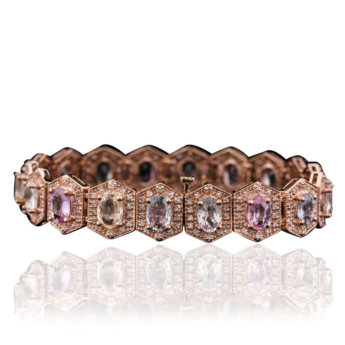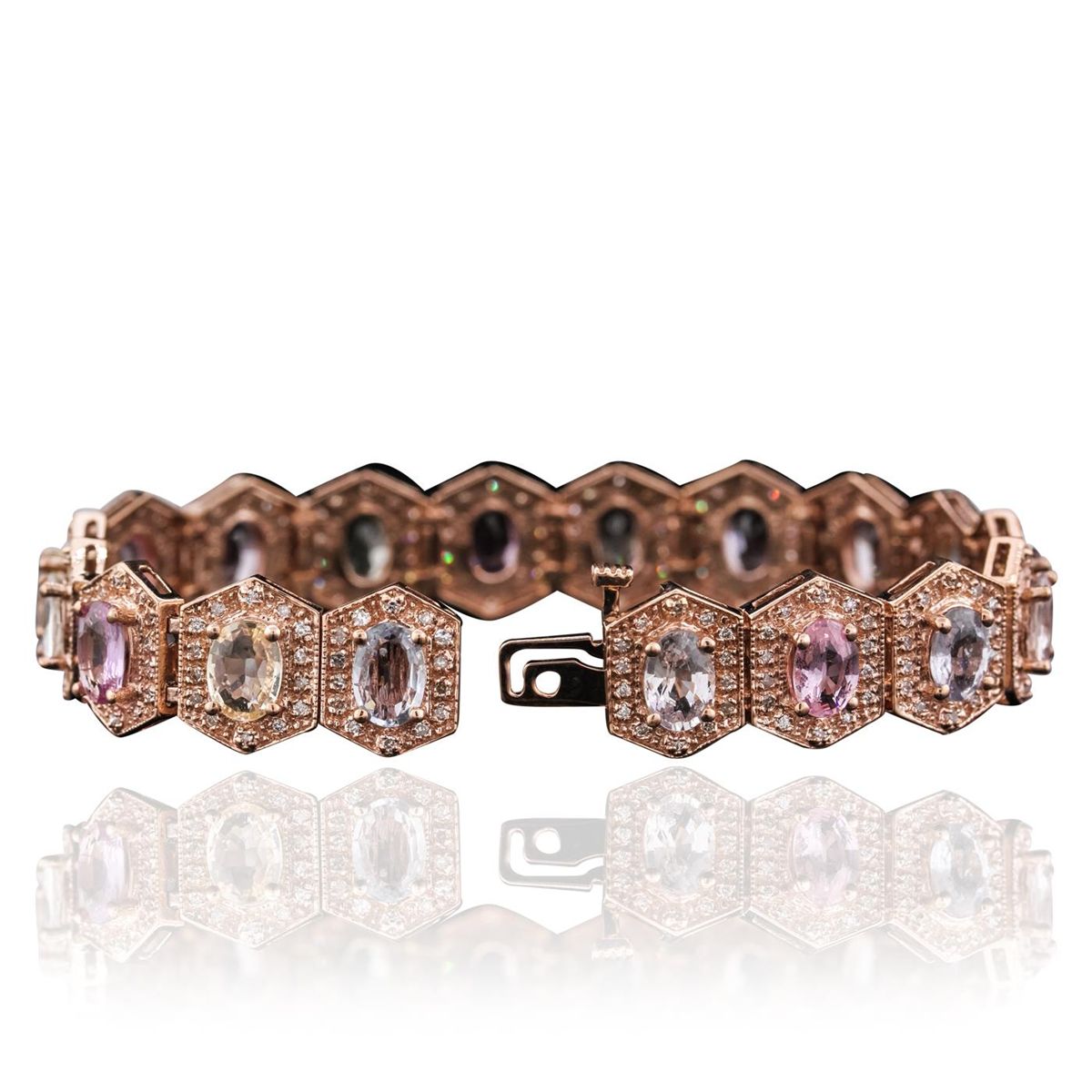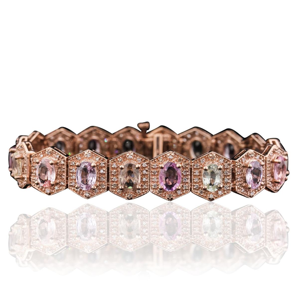 14KT Rose Gold 14.40ctw Multi-Color Sapphire and Diamond Bracelet. One electronically tested 14KT rose gold ladies combination cast & assembled bracelet with a hidden box clasp with a bright polish finish. Measurements: 6.85" in length. Identified with markings of "14K". Condition is new. Containing: Eighteen prong set oval modified brilliant cut natural multi-color sapphires, measuring 7.00 x 5.00 x 2.78mm, approximate total Weight of 14.40ct., clarity is slightly included, type II, medium light, very slightly grayish, green, purple, pink and blue color, (GIA vB 4/3), cut is good. Two Hundred Fifty-Two prong set round brilliant cut diamonds, measuring 1.20 - 1.20 x 0.72mm (depth est.) approximate total weight of 252 Stones = 1.68ct. Clarity: I-1 to I-2. Color: J - K, Cut is Good. Colored gemstones are presumed to have been subjected to commonly used enhancement processes. All diamonds and colored gemstones are graded in the mounting, unless otherwise stated. Total Weight of Colored Stones 14.40ct. Total Weight of Diamonds 1.68ct. Total Weight of Bracelet 28.00 grams. GGL Appraised at $14,925.00.