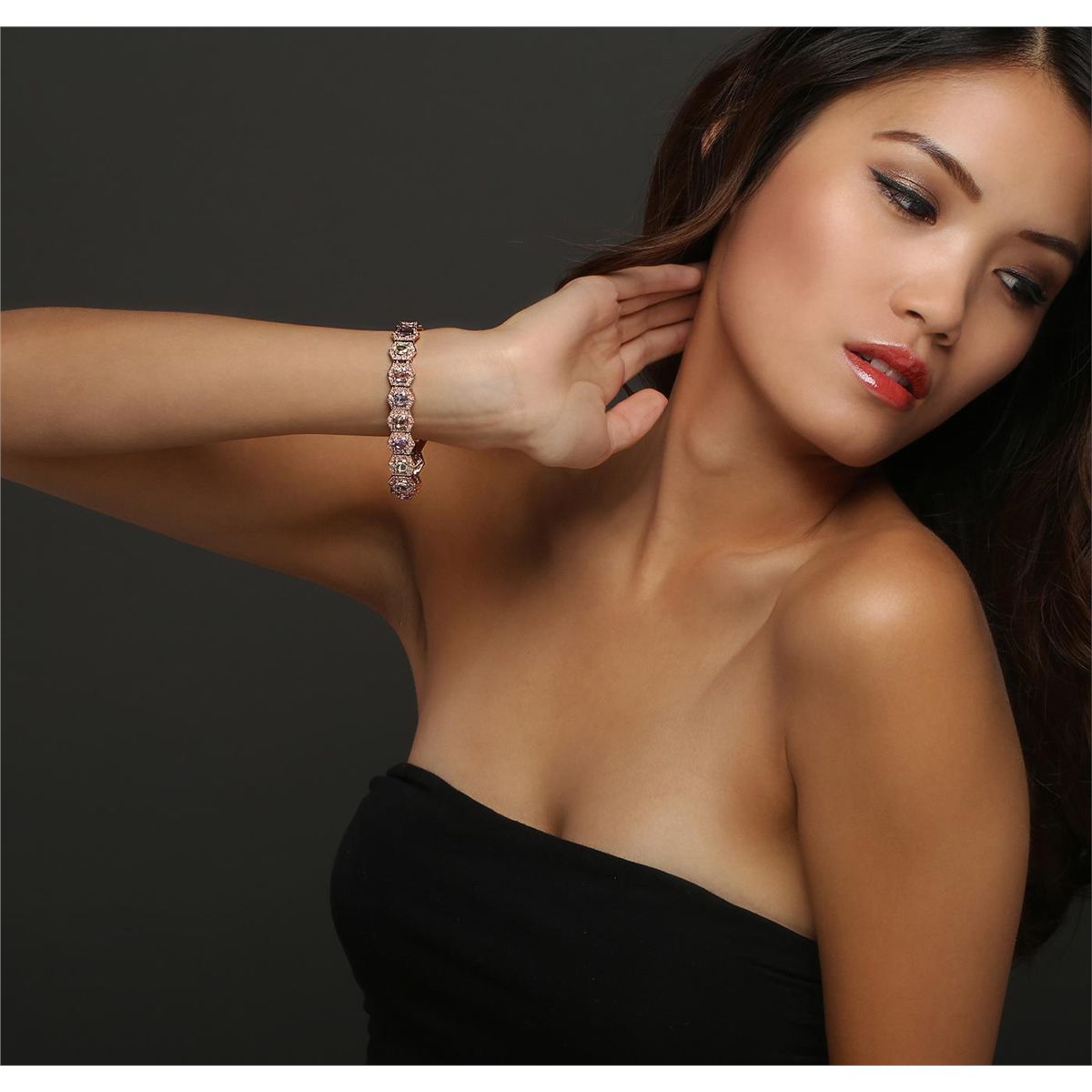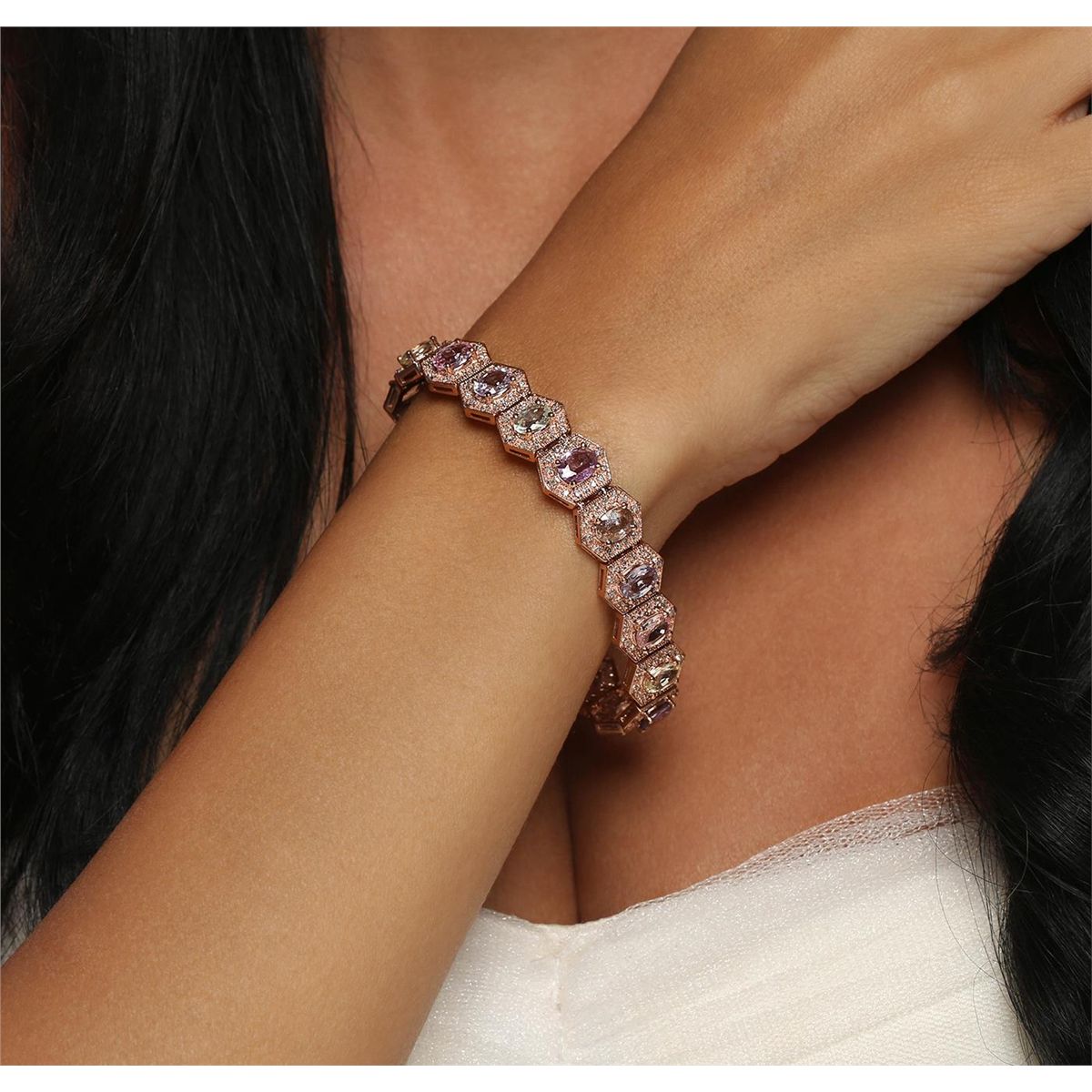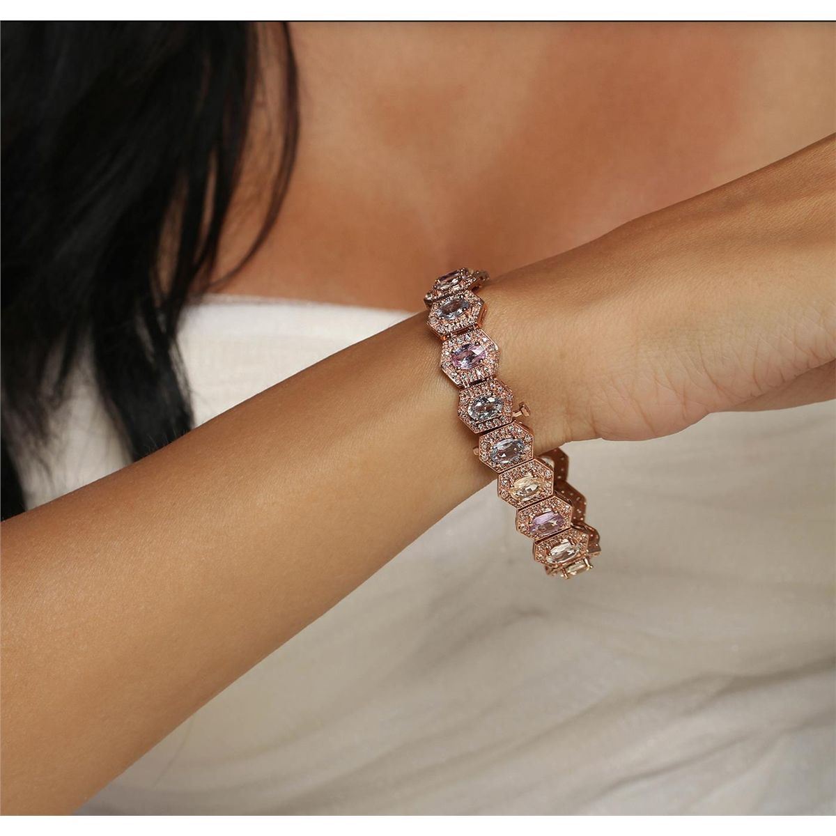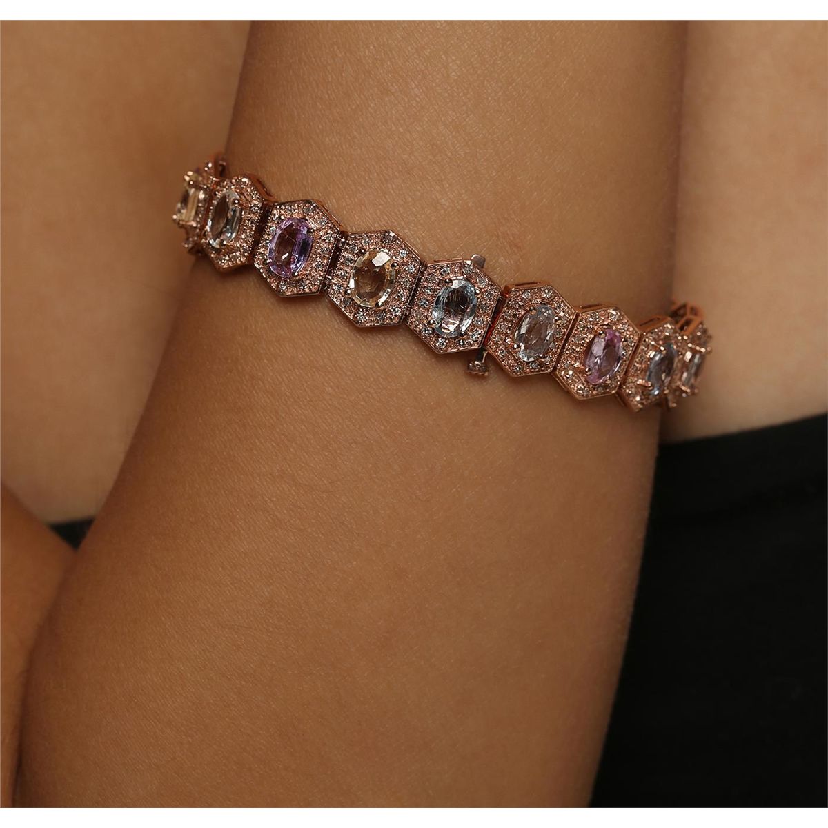 14KT Rose Gold 14.40ctw Multi-Color Sapphire and Diamond Bracelet. One electronically tested 14KT rose gold ladies combination cast & assembled bracelet with a hidden box clasp with a bright polish finish. Measurements: 6.85" in length. Identified with markings of "14K". Condition is new. Containing: Eighteen prong set oval modified brilliant cut natural multi-color sapphires, measuring 7.00 x 5.00 x 2.78mm, approximate total Weight of 14.40ct., clarity is slightly included, type II, medium light, very slightly grayish, green, purple, pink and blue color, (GIA vB 4/3), cut is good. Two Hundred Fifty-Two prong set round brilliant cut diamonds, measuring 1.20 - 1.20 x 0.72mm (depth est.) approximate total weight of 252 Stones = 1.68ct. Clarity: I-1 to I-2. Color: J - K, Cut is Good. Colored gemstones are presumed to have been subjected to commonly used enhancement processes. All diamonds and colored gemstones are graded in the mounting, unless otherwise stated. Total Weight of Colored Stones 14.40ct. Total Weight of Diamonds 1.68ct. Total Weight of Bracelet 28.00 grams. GGL Appraised at $14,925.00.