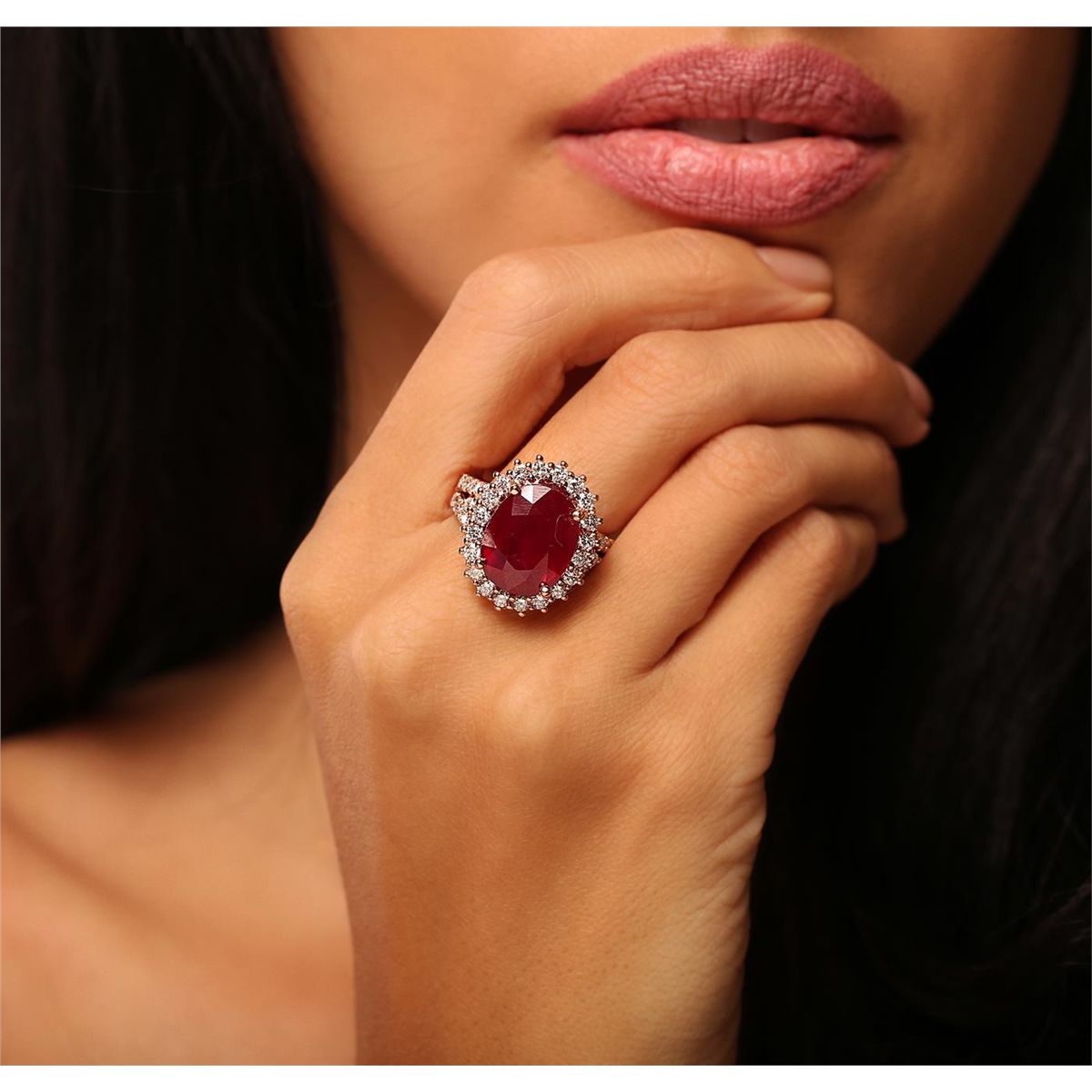 One electronically tested 14KT rose gold Ladies combination cast & assembled fancy ring with a high polish finish. Condition is new. Identified with markings of "14K". Containing: One prong set oval modified brilliant cut natural ruby, measuring 14.70 x 11.70 x 8.50mm, approximate weight of 14.46ct., clarity is heavily included, type II, medium dark, moderately strong, strongly purplish red color, (GIA stpR 6/4), cut is good. Colored gemstones are presumed to have been subjected to commonly used color/clarity enhancement processes. Forty-Two bead set round brilliant cut diamonds, measuring 2.10 - 2.10 x 1.26mm (depth est.) approximate. Total Weight of 42 Stones = 1.82ct. Clarity: SI-1 to SI-2. Color: G - H, Cut is Good. Total Weight of Colored Stones 14.46ct. Total Weight of Diamonds 1.82ct. Total Weight of Ring 11.50 grams. GGL Appraised at $14,645.00.