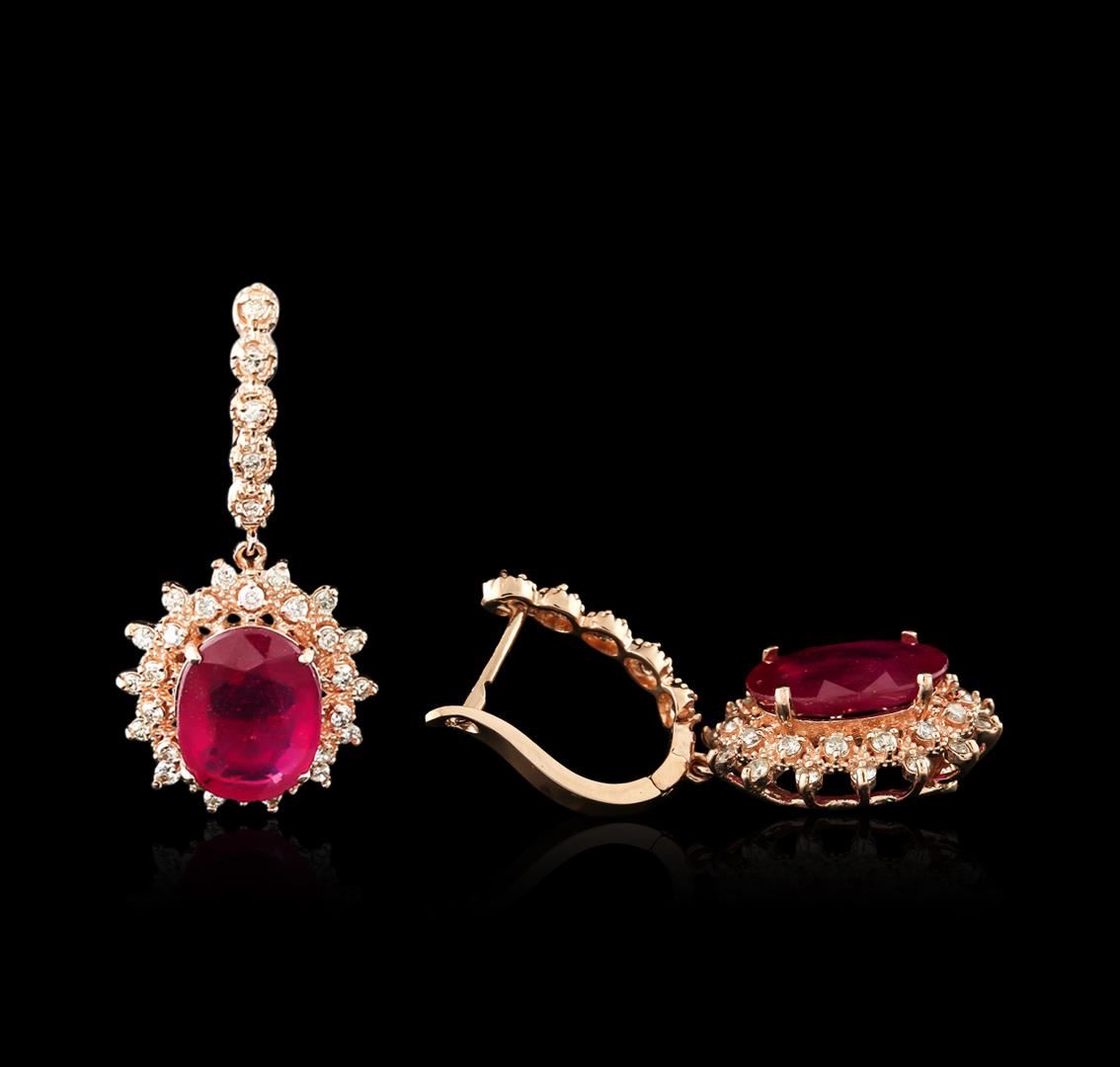 One pair electronically tested 14KT rose gold ladies cast ruby and diamond earrings with hinged clip backs with a bright polish finish. Identified with markings of "14K". Condition is new. Containing: Two prong set oval oval modified brilliant cut natural rubies, measuring 13.50 x 10.00 x 6.50mm, approximate total weight of 14.74ct., clarity is heavily included, type II, medium, very slightly brownish, strongly purplish red color, (GIA stpR 5/3), cut is good. Sixty-Six prong set round brilliant cut diamonds, measuring 1.70 - 1.50 x 0.96mm (depth est.) approximate total weight of 66 Stones = 0.98ct. Clarity: SI-1 to I-1. Color: L - N, Cut is Good. Diamonds and colored gemstones are graded in the mounting, unless otherwise stated. Colored gemstones are presumed to have been subjected to commonly used enhancement processes. Total Weight of Colored Stones 14.74ct. Total Weight of Diamonds 0.98ct. Total Weight of Earrings 10.60 grams. GGL Appraised at $4,805.00.