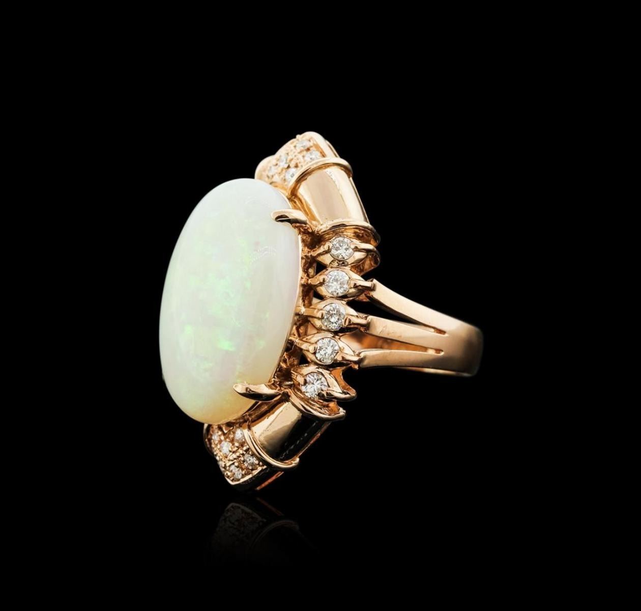 One electronically tested 14KT rose gold ladies cast opal and diamond ring with a bright polish finish. Identified with markings of "14K". Condition is new. Containing: One white opal that is cut in a oval shaped cabochon and is prong set, measuring 21.80 mm long x 16.77 mm wide, and 6.50 mm thick and the approximate weight is 14.82 carats. The opal has a somewhat bright, green only play of color (fire) in a flashfire pattern; a dome; a good cut; no inclusions; consistent in its brightness and pattern; and is somewhat directional. Twenty-Eight prong set round brilliant cut diamonds, measuring 2.10 - 1.30 x 1.02mm (depth est.) approximate total weight of 28 Stones = 0.50ct.. Clarity: SI-2 to I-1. Color: H - I, Cut is Good. Colored gemstones are presumed to have been subjected to commonly used enhancement processes. All diamonds and colored gemstones are graded in the mounting, unless otherwise stated.. Total Weight of Diamonds 0.50ct.. Total Weight of Opals 14.82ct.. Total Weight of Ring 12.70 grams. GGL Appraised.