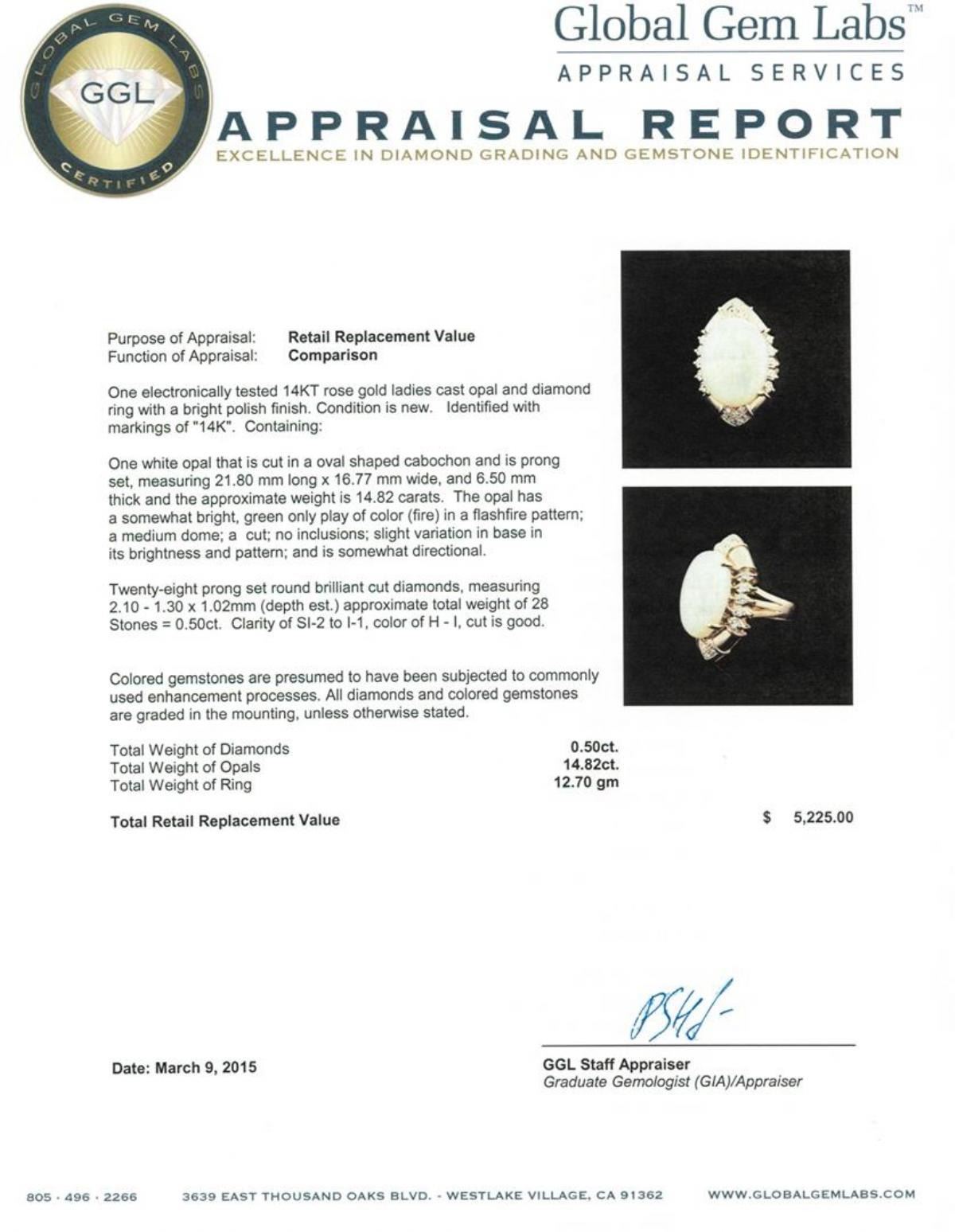 One electronically tested 14KT rose gold ladies cast opal and diamond ring with a bright polish finish. Identified with markings of "14K". Condition is new. Containing: One white opal that is cut in a oval shaped cabochon and is prong set, measuring 21.80 mm long x 16.77 mm wide, and 6.50 mm thick and the approximate weight is 14.82 carats. The opal has a somewhat bright, green only play of color (fire) in a flashfire pattern; a dome; a good cut; no inclusions; consistent in its brightness and pattern; and is somewhat directional. Twenty-Eight prong set round brilliant cut diamonds, measuring 2.10 - 1.30 x 1.02mm (depth est.) approximate total weight of 28 Stones = 0.50 ct.. Clarity: SI-2 to I-1. Color: H - I, Cut is Good. Colored gemstones are presumed to have been subjected to commonly used enhancement processes. All diamonds and colored gemstones are graded in the mounting, unless otherwise stated.. Total Weight of Diamonds 0.50 ct.. Total Weight of Opals 14.82ct.. Total Weight of Ring 12.70 grams. GGL Appraised.