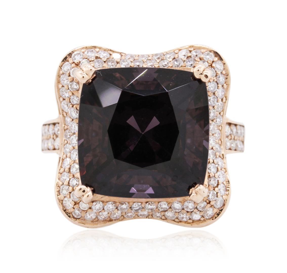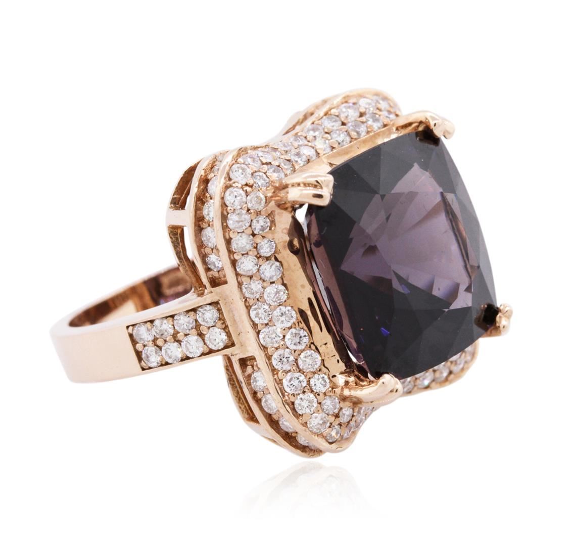 One electronically tested 14KT rose gold ladies combination cast & assembled spinel and diamond ring with a bright polish finish. Identified with markings of "14K". Condition is new. Containing: One prong set square cushion modified brilliant cut natural lavender spinel, measuring 13.39 x 13.85 x 9.56mm, approximate weight of 15.00ct., clarity is eye clean, type II, dark, very slightly grayish, purple color, (GIA P 7/3), cut is good. One Hundred Thirty prong set round brilliant cut diamonds, measuring 1.30 - 1.10 x 0.72mm (depth est.) approximate total weight of 130 Stones = 0.82ct. Clarity: SI-2 to I-1. Color: H - I, Cut is Good. Colored gemstones are presumed to have been subjected to commonly used enhancement processes. All diamonds and colored gemstones are graded in the mounting, unless otherwise stated. Total Weight of Colored Stones 15.00ct. Total Weight of Diamonds 0.82ct. Total Weight of Ring 10.10 grams. GGL Appraised at $12,800.00.