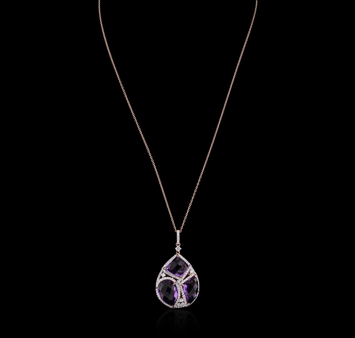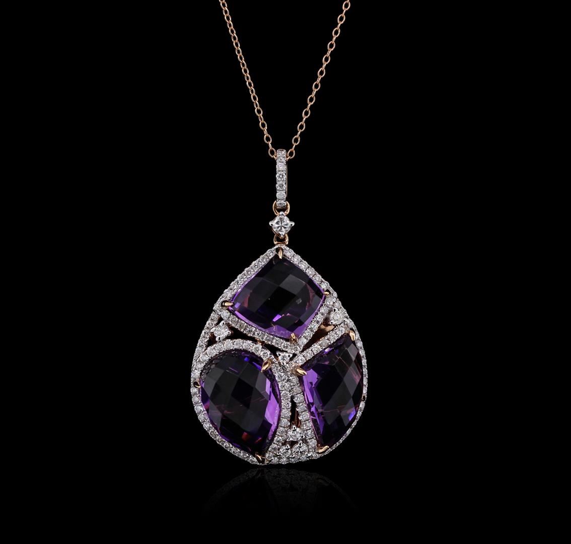 One pendant with chain featuring: 14KT rose gold weighing 6.00 grams containing three amethysts with a total weight of 15.02ct and 118 round diamonds with a total weight of 0.98ct.
