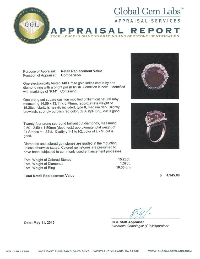 One electronically tested 14KT rose gold ladies cast ruby and diamond ring with a bright polish finish. Identified with markings of "K14". Condition is new. Containing: One prong set square cushion modified brilliant cut natural ruby, measuring 14.09 x 13.11 x 8.79mm, approximate weight of 15.28ct., clarity is heavily included, type II, medium dark, slightly brownish, strongly purplish red color, (GIA stpR 6/2), cut is good. Twenty-Four prong set round brilliant cut diamonds, measuring 2.50 - 2.50 x 1.50mm (depth est.) approximate total weight of 24 Stones = 1.37ct. Clarity: I-1 to I-2. Color: L - M, Cut is Good. Diamonds and colored gemstones are graded in the mounting, unless otherwise stated. Colored gemstones are presumed to have been subjected to commonly used enhancement processes. Total Weight of Colored Stones 15.28ct. Total Weight of Diamonds 1.37ct. Total Weight of Ring 10.30 grams. GGL Appraised at $4,945.00.