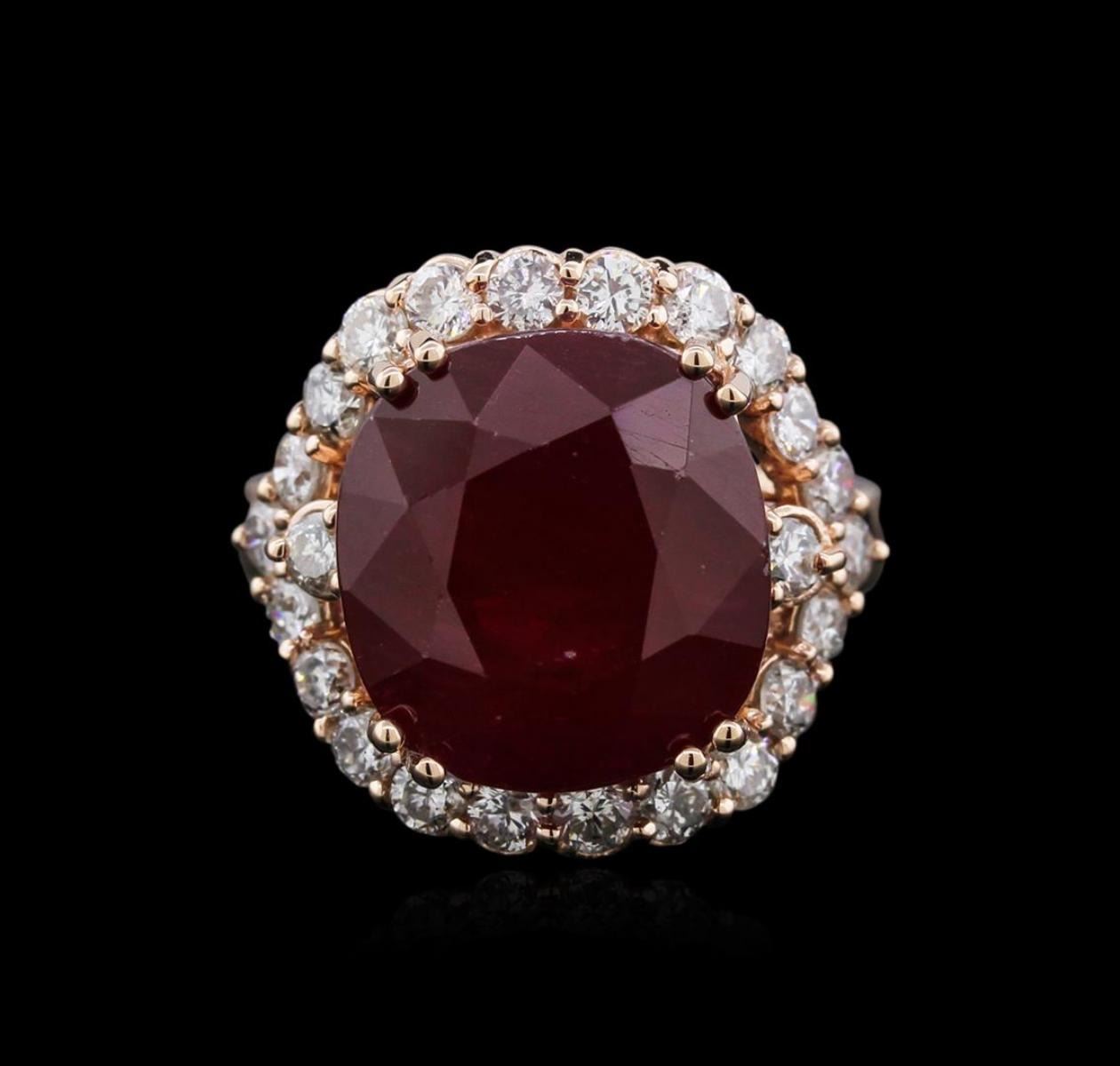 One electronically tested 14KT rose gold ladies cast ruby and diamond ring with a bright polish finish. Identified with markings of "K14". Condition is new. Containing: One prong set square cushion modified brilliant cut natural ruby, measuring 14.09 x 13.11 x 8.79mm, approximate weight of 15.28ct., clarity is heavily included, type II, medium dark, slightly brownish, strongly purplish red color, (GIA stpR 6/2), cut is good. Twenty-Four prong set round brilliant cut diamonds, measuring 2.50 - 2.50 x 1.50mm (depth est.) approximate total weight of 24 Stones = 1.37ct. Clarity: I-1 to I-2. Color: L - M, Cut is Good. Diamonds and colored gemstones are graded in the mounting, unless otherwise stated. Colored gemstones are presumed to have been subjected to commonly used enhancement processes. Total Weight of Colored Stones 15.28ct. Total Weight of Diamonds 1.37ct. Total Weight of Ring 10.30 grams. GGL Appraised at $4,945.00.
