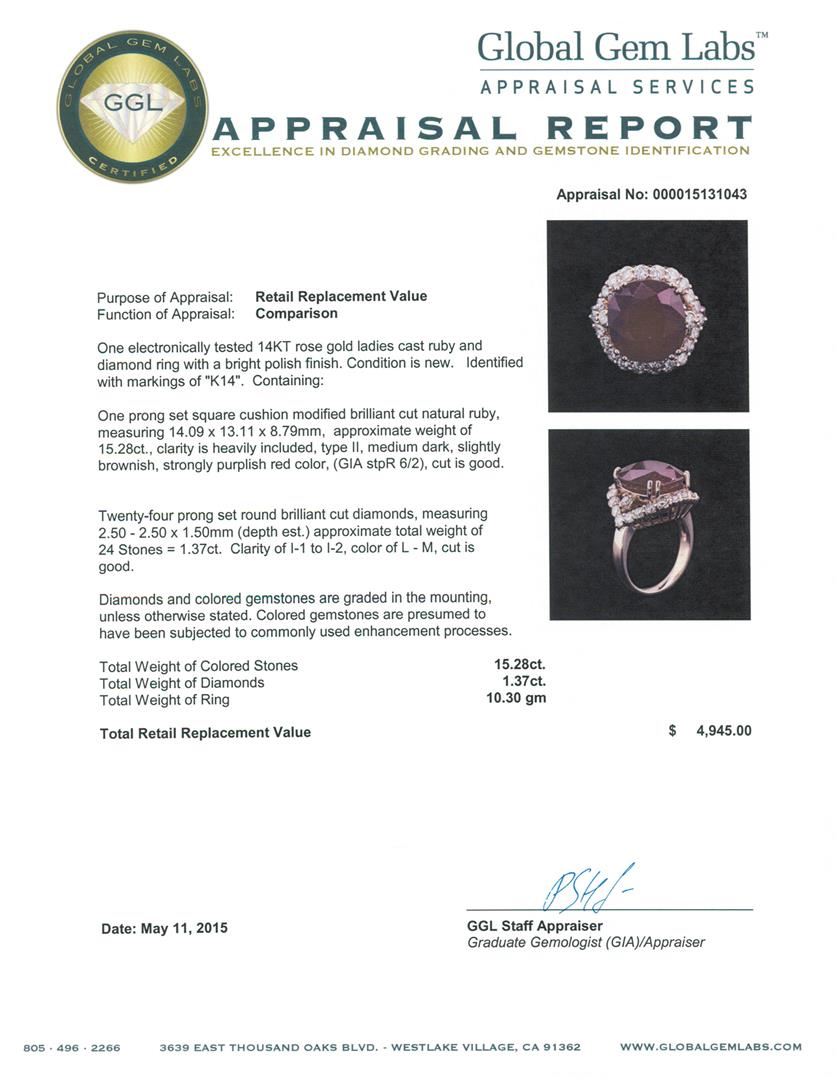 One electronically tested 14KT rose gold ladies cast ruby and diamond ring with a bright polish finish. Identified with markings of "K14". Condition is new. Containing: One prong set square cushion modified brilliant cut natural ruby, measuring 14.09 x 13 GGL Appraised at $4,945.00.