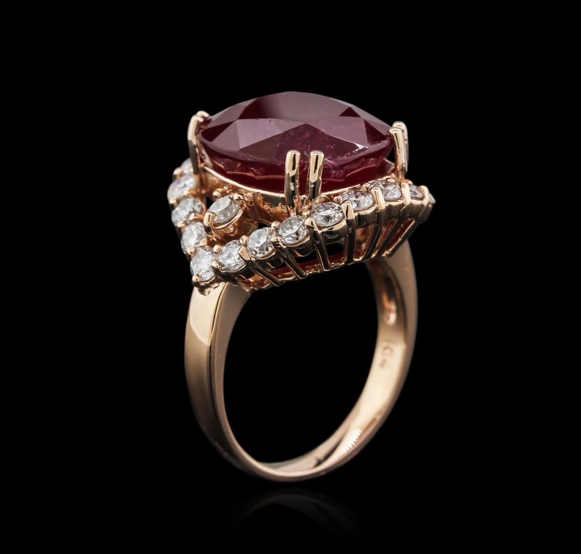 One electronically tested 14KT rose gold ladies cast ruby and diamond ring with a bright polish finish. Identified with markings of "K14". Condition is new. Containing: One prong set square cushion modified brilliant cut natural ruby, measuring 14.09 x 13.11 x 8.79mm, approximate weight of 15.28ct., clarity is heavily included, type II, medium dark, slightly brownish, strongly purplish red color, (GIA stpR 6/2), cut is good. Twenty-Four prong set round brilliant cut diamonds, measuring 2.50 - 2.50 x 1.50mm (depth est.) approximate total weight of 24 Stones = 1.37ct. Clarity: I-1 to I-2. Color: L - M, Cut is Good. Diamonds and colored gemstones are graded in the mounting, unless otherwise stated. Colored gemstones are presumed to have been subjected to commonly used enhancement processes. Total Weight of Colored Stones 15.28ct. Total Weight of Diamonds 1.37ct. Total Weight of Ring 10.30 grams. GGL Appraised at $4,945.00.