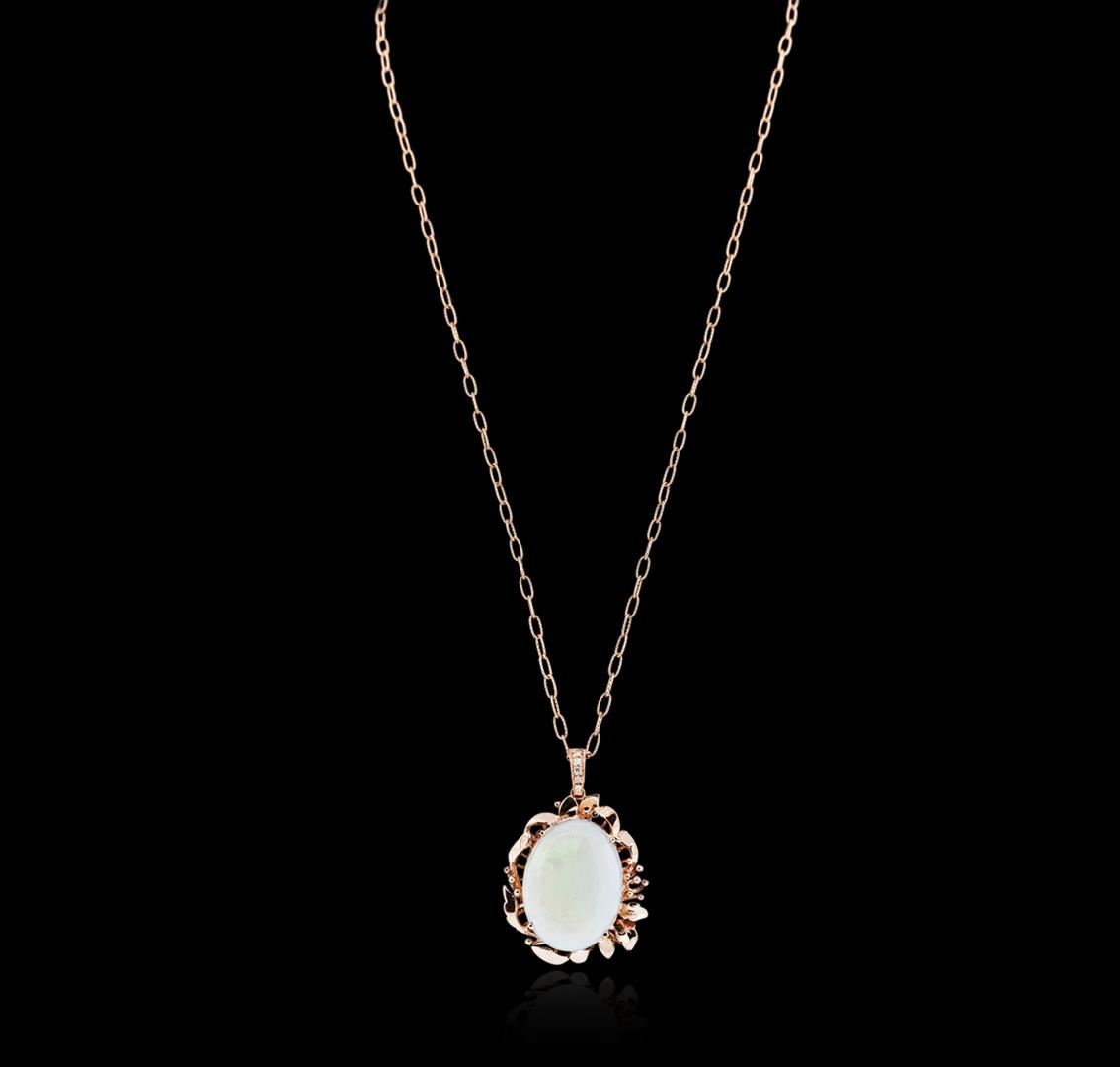 One electronically tested 14KT rose gold ladies cast opal and diamond pendant & chain 18.0" long, with a lobster claw clasp with a bright polish finish. Identified with markings of "14K". Condition is new. Containing: Five prong set round brilliant cut diamonds, measuring 1.30 - 1.30 x 0.78mm (depth est.) approximate total weight of 5 Stones = 0.04ct. Clarity: SI-1 to SI-2. Color: I - J, Cut is Good. One white opal that is cut in a oval shape and is prong set, measuring 24.88 mm long x 18.75 mm wide, and 7.48 mm thick and the approximate weight is 15.31 carats. The opal has a dull, green-orange play of color (fire) in a pattern; a medium dome; a good cut; no inclusions; consistent in its brightness and pattern; and is somewhat directional. Colored gemstones are presumed to have been subjected to commonly used enhancement processes. All diamonds and colored gemstones are graded in the mounting, unless otherwise stated. Total Weight of Diamonds 0.04ct. Total Weight of Opals 15.31ct. Total Weight of Pendant & Chain 15.90 grams. GGL Appraised at $5,150.00.