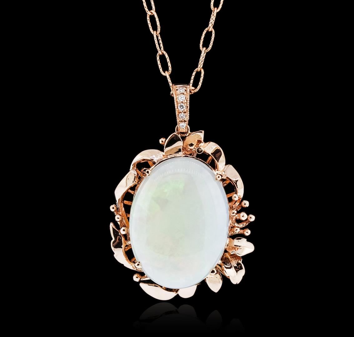 One electronically tested 14KT rose gold ladies cast opal and diamond pendant & chain 18.0" long, with a lobster claw clasp with a bright polish finish. Identified with markings of "14K". Condition is new. Containing: Five prong set round brilliant cut diamonds, measuring 1.30 - 1.30 x 0.78mm (depth est.) approximate total weight of 5 Stones = 0.04ct. Clarity: SI-1 to SI-2. Color: I - J, Cut is Good. One white opal that is cut in a oval shape and is prong set, measuring 24.88 mm long x 18.75 mm wide, and 7.48 mm thick and the approximate weight is 15.31 carats. The opal has a dull, green-orange play of color (fire) in a pattern; a medium dome; a good cut; no inclusions; consistent in its brightness and pattern; and is somewhat directional. Colored gemstones are presumed to have been subjected to commonly used enhancement processes. All diamonds and colored gemstones are graded in the mounting, unless otherwise stated. Total Weight of Diamonds 0.04ct. Total Weight of Opals 15.31ct. Total Weight of Pendant & Chain 15.90 grams. GGL Appraised at $5,150.00.
