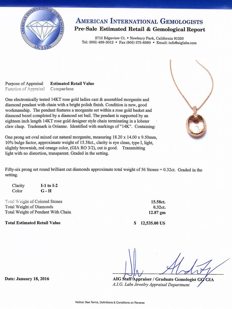 One electronically tested 14KT rose gold ladies cast & assembled morganite and diamond pendant with chain with a bright polish finish. The pendant features a morganite set within a rose gold basket and diamond bezel completed by a diamond set bail. The pendant is supported by an eighteen inch length 14KT rose gold designer style chain terminating in a lobster claw clasp. Trademark is Orianne. Identified with markings of "14K". Condition is new, good workmanship. Containing: One prong set oval mixed cut natural morganite, measuring 18.20 x 14.00 x 9.50mm, 10%. bulge factor, approximate weight of 15.58ct., clarity is eye clean, type I, light, slightly brownish, red orange color, (GIA RO 3/2), cut is good. Transmitting light with no distortion, transparent. Graded in the setting.Fifty-Six prong set round brilliant cut diamonds approximate. Total Weight of 56 Stones = 0.32ct. Graded in the setting. Clarity: I-1 to I-2. Color: G - H. Total Weight of Colored Stones 15.58ct. Total Weight of Diamonds 0.32ct. Total Weight of Pendant With Chain 12.87gm. AIG Appraised at $12,535.00.