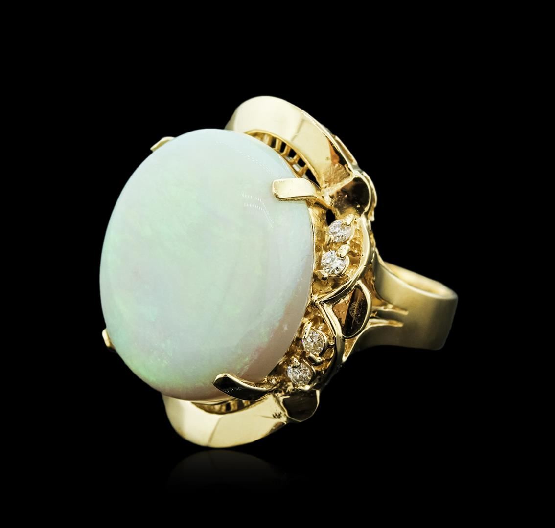 One electronically tested 14KT rose gold ladies cast opal and diamond ring with a bright polish finish. Identified with markings of "14K". Condition is new. Containing: Eight prong set round brilliant cut diamonds, measuring 2.00 - 2.00 x 1.20mm (depth est.) approximate total weight of 8 Stones = 0.23ct.. Clarity: SI-1 to SI-2. Color: I - J, Cut is Good. One white opal that is cut in a oval shaped cabochon and is prong set, measuring 21.52 mm long x 19.00 mm wide, and 6.50 mm thick and the approximate weight is 16.57 carats. The opal has a somewhat bright, green only play of color (fire) in a flashfire pattern; a dome; a good cut; no inclusions; consistent in its brightness and pattern; and is somewhat directional. Colored gemstones are presumed to have been subjected to commonly used enhancement processes. All diamonds and colored gemstones are graded in the mounting, unless otherwise stated.. Total Weight of Diamonds 0.23ct.. Total Weight of Opals 16.57ct.. Total Weight of Ring 13.00 grams. GGL Appraised at $4,855.00.
