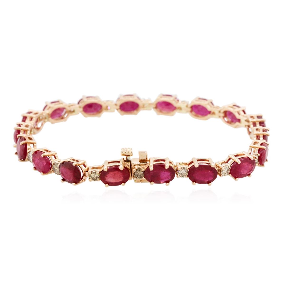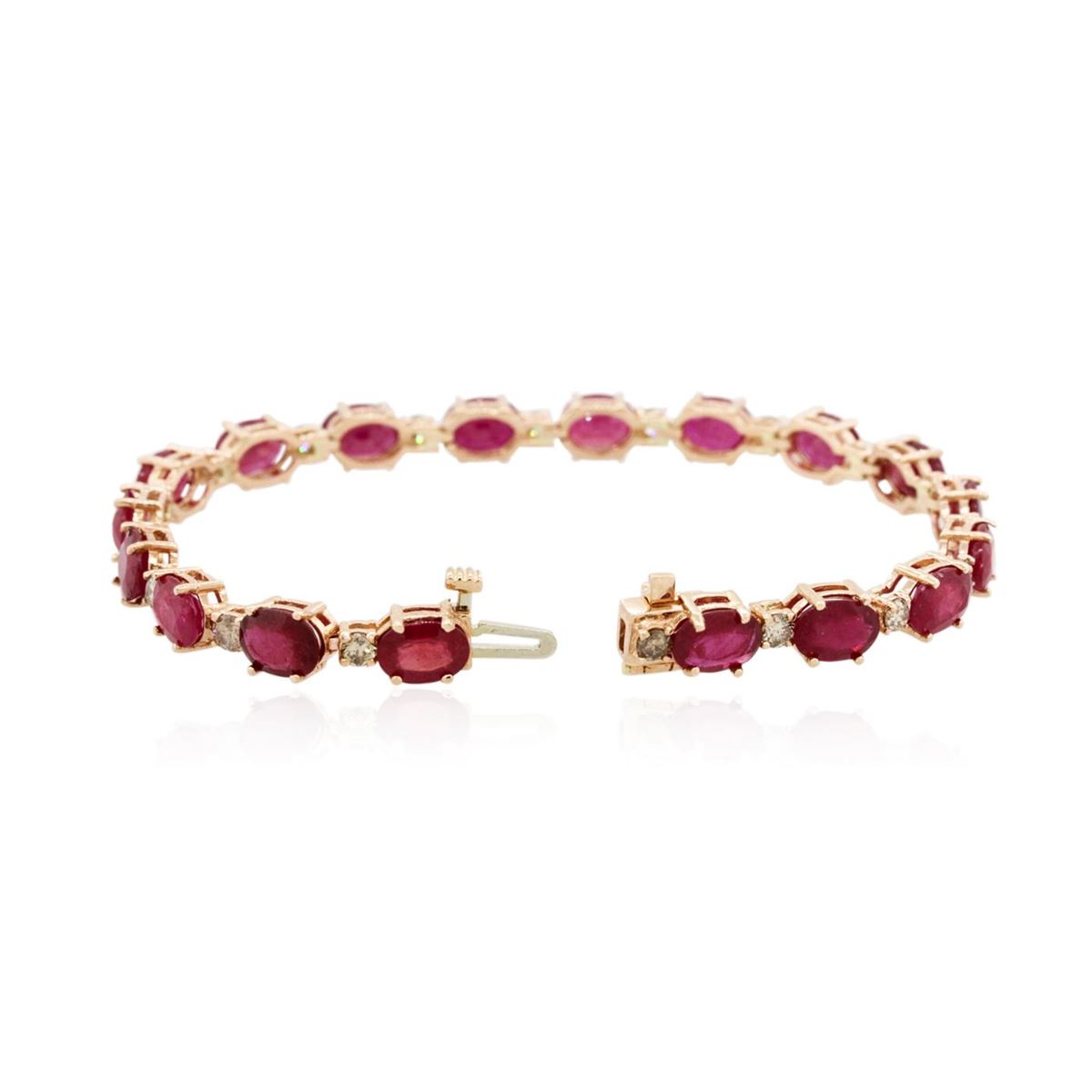 One electronically tested 14KT rose gold ladies cast & assembled ruby and diamond bracelet with a bright polish finish. Condition is new, good workmanship. Seven inch length bracelet features a flexible ribbon of rubies alternated by diamonds terminating in a concealed clasp with safety bar. Identified with markings of "14K". Containing: Eighteen prong set oval mixed cut natural rubies, measuring 7.00 x 5.00 x 3.25mm, 6%. bulge factor, approximate. Total Weight of 17.82ct., clarity is heavily included, type II, medium dark, moderately strong, slightly purplish red color, (GIA slpR 6/4), cut is good. Transmitting light somewhat diffusely, transparent to translucent. Naturally occurring internal & external characteristics are present. Indications of laboratory high temperature heat treatment, with glass & flux additives. Measurements & the color grade are an average for the group. Graded in the setting. Ruby has a low tolerance to rhodium plating, repolishing the surface, & ultrasonic cleaning. Eighteen prong set round brilliant cut diamonds, measuring 2.70 - 2.60 x 1.59mm (depth est.) approximate. Total Weight of 18 Stones = 1.32ct. Graded in the setting. Clarity: SI-1 to I-1. Total Weight of Colored Stones 17.82ct. Total Weight of Diamonds 1.32ct. Total Weight of Bracelet 12.00 grams. AIG Appraised at $5,420.00.