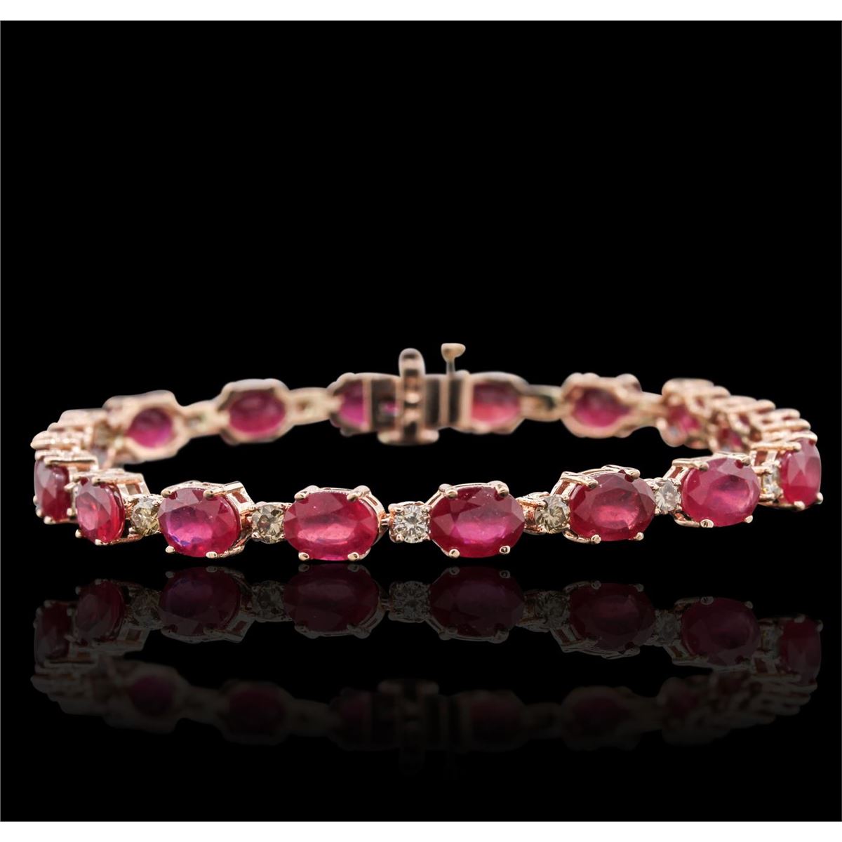 One electronically tested 14KT rose gold ladies cast & assembled ruby and diamond bracelet with a bright polish finish. Condition is new, good workmanship. Seven inch length bracelet features a flexible ribbon of rubies alternated by diamonds terminating in a concealed clasp with safety bar. Identified with markings of "14K". Containing: Eighteen prong set oval mixed cut natural rubies, measuring 7.00 x 5.00 x 3.25mm, 6%. bulge factor, approximate. Total Weight of 17.82ct., clarity is heavily included, type II, medium dark, moderately strong, slightly purplish red color, (GIA slpR 6/4), cut is good. Transmitting light somewhat diffusely, transparent to translucent. Naturally occurring internal & external characteristics are present. Indications of laboratory high temperature heat treatment, with glass & flux additives. Measurements & the color grade are an average for the group. Graded in the setting. Ruby has a low tolerance to rhodium plating, repolishing the surface, & ultrasonic cleaning. Eighteen prong set round brilliant cut diamonds, measuring 2.70 - 2.60 x 1.59mm (depth est.) approximate. Total Weight of 18 Stones = 1.32ct. Graded in the setting. Clarity: SI-1 to I-1. Total Weight of Colored Stones 17.82ct. Total Weight of Diamonds 1.32ct. Total Weight of Bracelet 12.00 grams. AIG Appraised at $5,420.00.