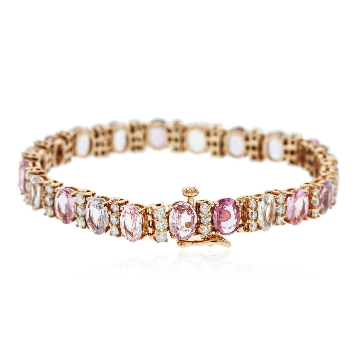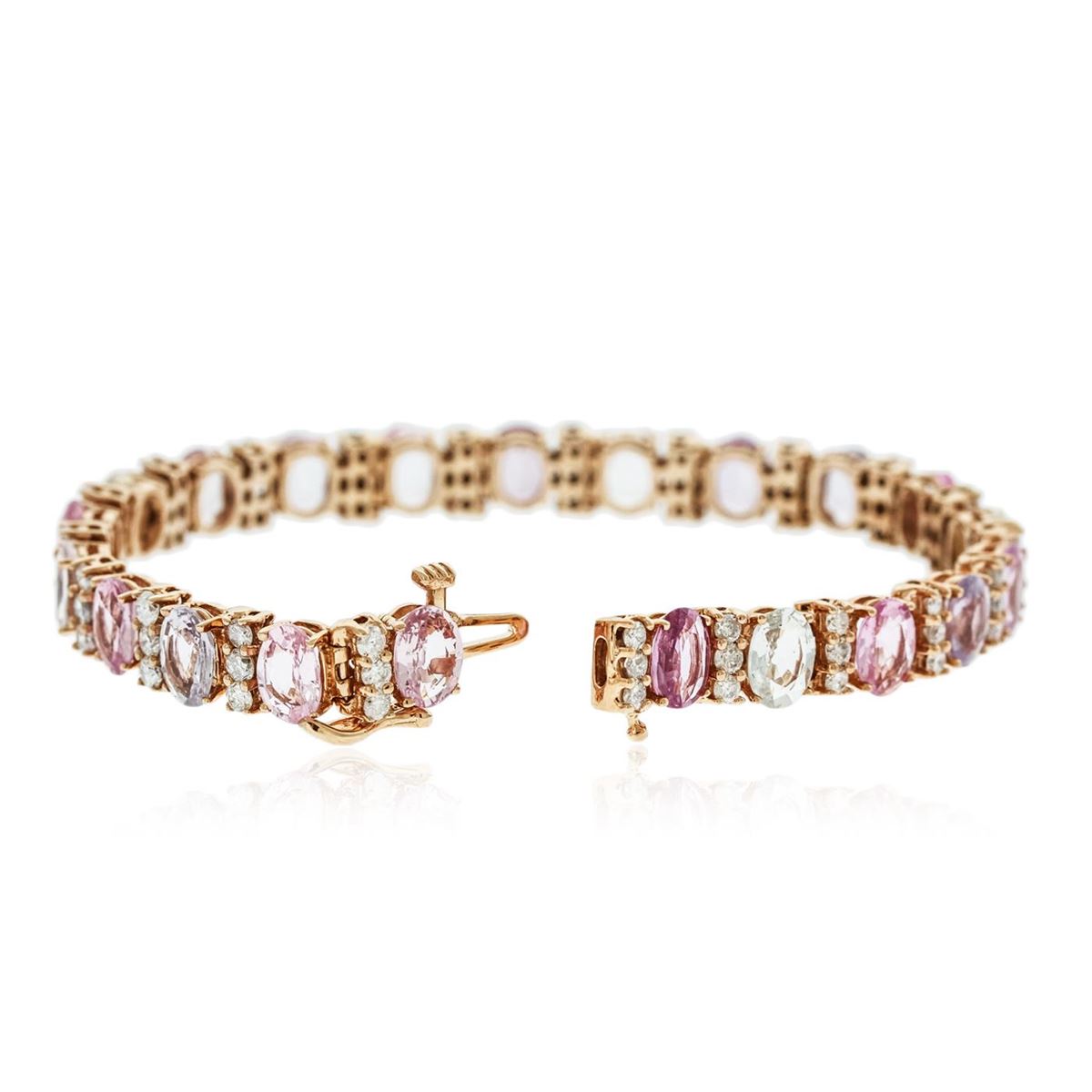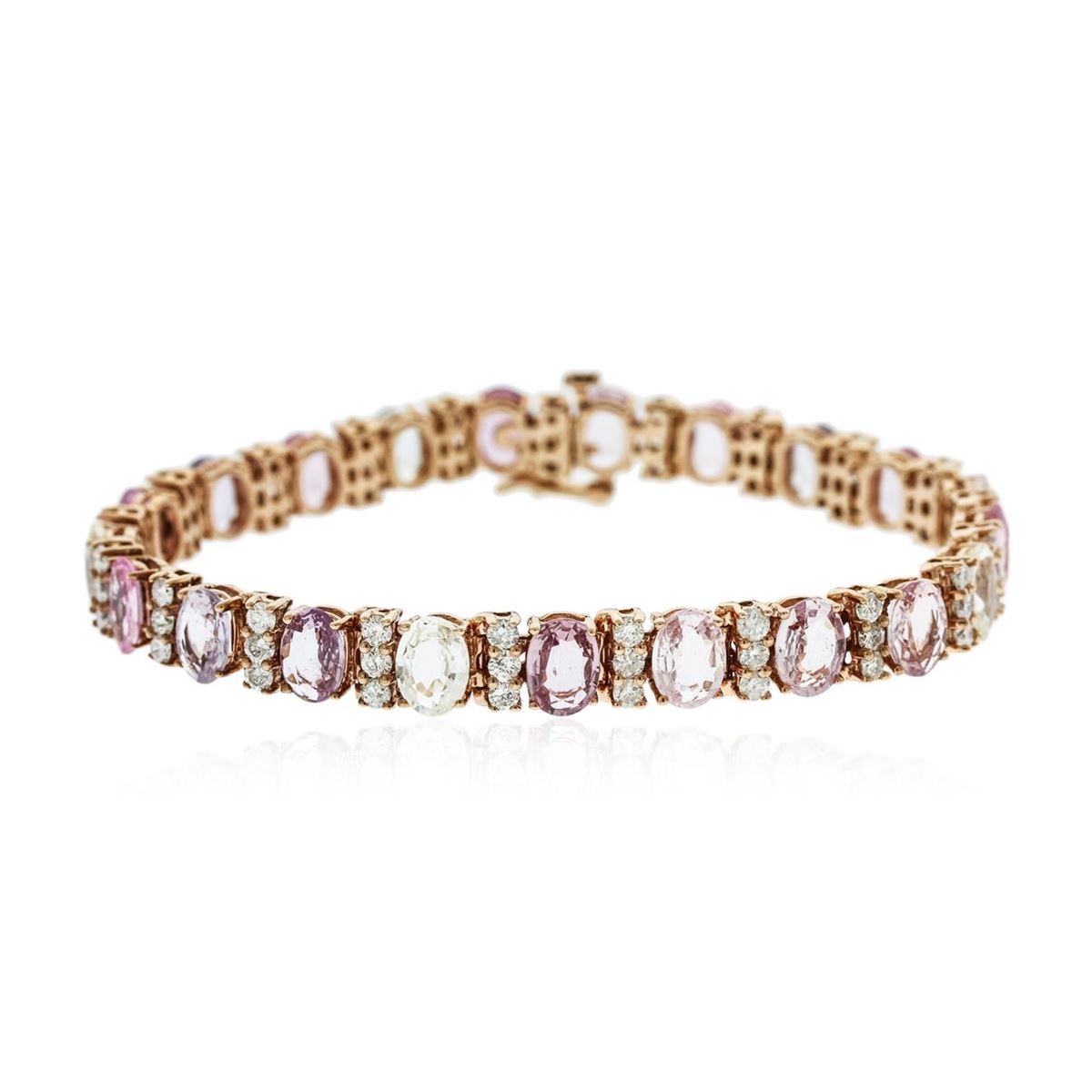 One electronically tested 14KT rose gold ladies combination cast & assembled bracelet with a bright polish finish. Measurements: 6.85" in length. Identified with markings of "14K". Condition is new. Containing: Twenty-one prong set oval modified brilliant cut natural multicolor sapphires, measuring 7.00 x 5.00 x 3.17mm, approximate total weight of 19.11ct., clarity is slightly included, type II, medium light, slightly grayish, purple white and pink color, (GIA PR 4/2), cut is good. Forty-Three prong set round brilliant cut diamonds, measuring 2.20 - 2.20 x 1.32mm (depth est.) approximate total weight of 43 Stones = 2.66ct. Clarity: I-1 to I-2. Color: I - J, Cut is Good. Colored gemstones are presumed to have been subjected to commonly used enhancement processes. All diamonds and colored gemstones are graded in the mounting, unless otherwise stated. Total Weight of Colored Stones 19.11ct. Total Weight of Diamonds 2.66ct. Total Weight of Bracelet 18.20 grams. GGL Appraised at $18,605.00.
