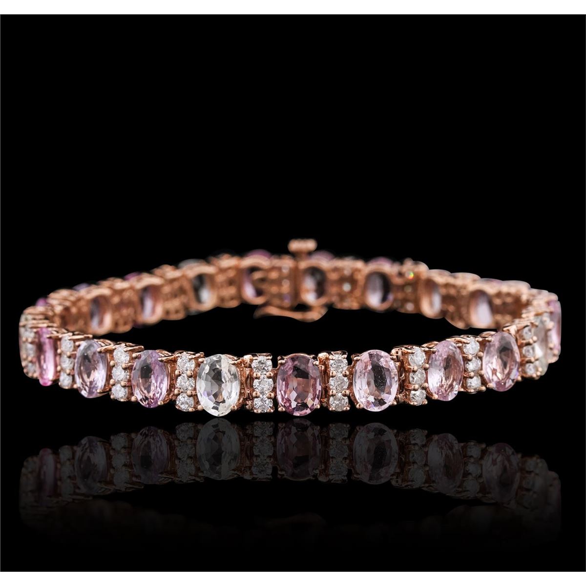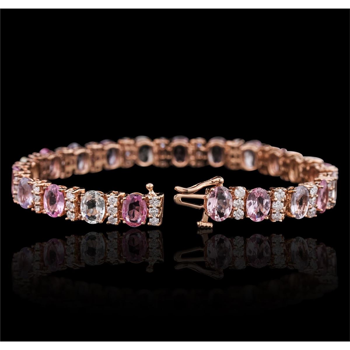 One electronically tested 14KT rose gold ladies combination cast & assembled bracelet with a bright polish finish. Measurements: 6.85" in length. Identified with markings of "14K". Condition is new. Containing: Twenty-one prong set oval modified brilliant cut natural multicolor sapphires, measuring 7.00 x 5.00 x 3.17mm, approximate total weight of 19.11ct., clarity is slightly included, type II, medium light, slightly grayish, purple white and pink color, (GIA PR 4/2), cut is good. Forty-Three prong set round brilliant cut diamonds, measuring 2.20 - 2.20 x 1.32mm (depth est.) approximate total weight of 43 Stones = 2.66ct. Clarity: I-1 to I-2. Color: I - J, Cut is Good. Colored gemstones are presumed to have been subjected to commonly used enhancement processes. All diamonds and colored gemstones are graded in the mounting, unless otherwise stated. Total Weight of Colored Stones 19.11ct. Total Weight of Diamonds 2.66ct. Total Weight of Bracelet 18.20 grams. GGL Appraised at $18,605.00.