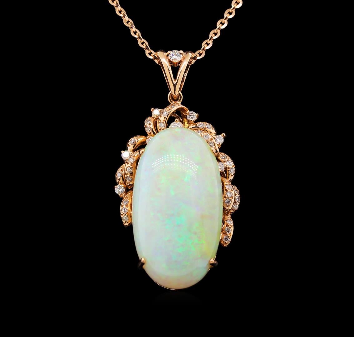 One electronically tested 14KT rose gold ladies cast opal and diamond pendant & chain 18.0" long, with a lobster claw clasp with a bright polish finish. Identified with markings of "14K". Condition is new. Containing: One white opal that is cut in a oval shaped cabochon and is prong set, measuring 29.00 mm long x 15.00 mm wide, and 7.20 mm thick and the approximate weight is 19.53 carats. The opal has a somewhat bright, green only play of color (fire) in a flashfire pattern; a medium dome; a good cut; no inclusions; slight variation in base in its brightness and pattern; and is somewhat directional. Thirty-Seven prong set round brilliant cut diamonds, measuring 2.50 - 1.30 x 1.14mm (depth est.) approximate total weight of 37 Stones = 0.30ct. Clarity: SI-1 to I-1. Color: I - J, Cut is Good. Colored gemstones are presumed to have been subjected to commonly used enhancement processes. All colored gemstones are graded in the mounting, unless otherwise stated. Total Weight of Diamonds 0.30ct. Total Weight of Opals 19.53ct. Total Weight of Pendant & Chain 14.70 grams. GGL Appraised at $4,275.00.