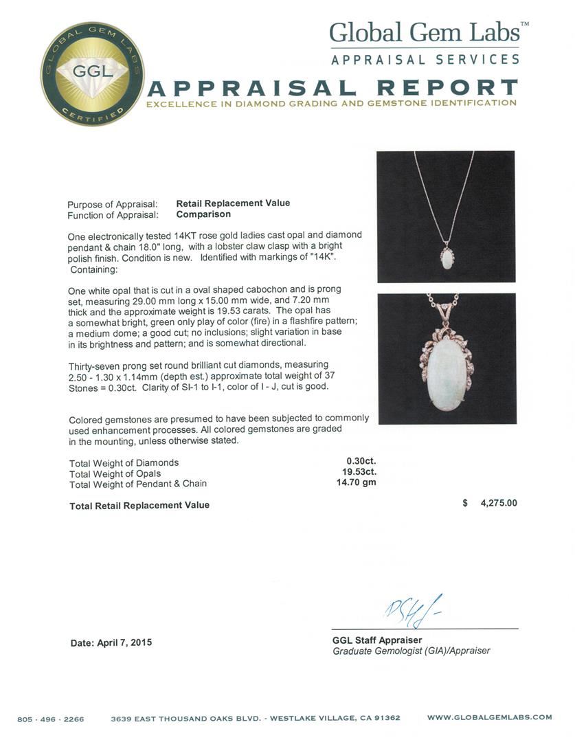 One electronically tested 14KT rose gold ladies cast opal and diamond pendant & chain 18.0" long, with a lobster claw clasp with a bright polish finish. Identified with markings of "14K". Condition is new. Containing: One white opal that is cut in a oval shaped cabochon and is prong set, measuring 29.00 mm long x 15.00 mm wide, and 7.20 mm thick and the approximate weight is 19.53 carats. The opal has a somewhat bright, green only play of color (fire) in a flashfire pattern; a medium dome; a good cut; no inclusions; slight variation in base in its brightness and pattern; and is somewhat directional. Thirty-Seven prong set round brilliant cut diamonds, measuring 2.50 - 1.30 x 1.14mm (depth est.) approximate total weight of 37 Stones = 0.30 ct. Clarity: SI-1 to I-1. Color: I - J, Cut is Good. Colored gemstones are presumed to have been subjected to commonly used enhancement processes. All colored gemstones are graded in the mounting, unless otherwise stated. Total Weight of Diamonds 0.30 ct. Total Weight of Opals 19.53ct. Total Weight of Pendant & Chain 14.70 grams. GGL Appraised.