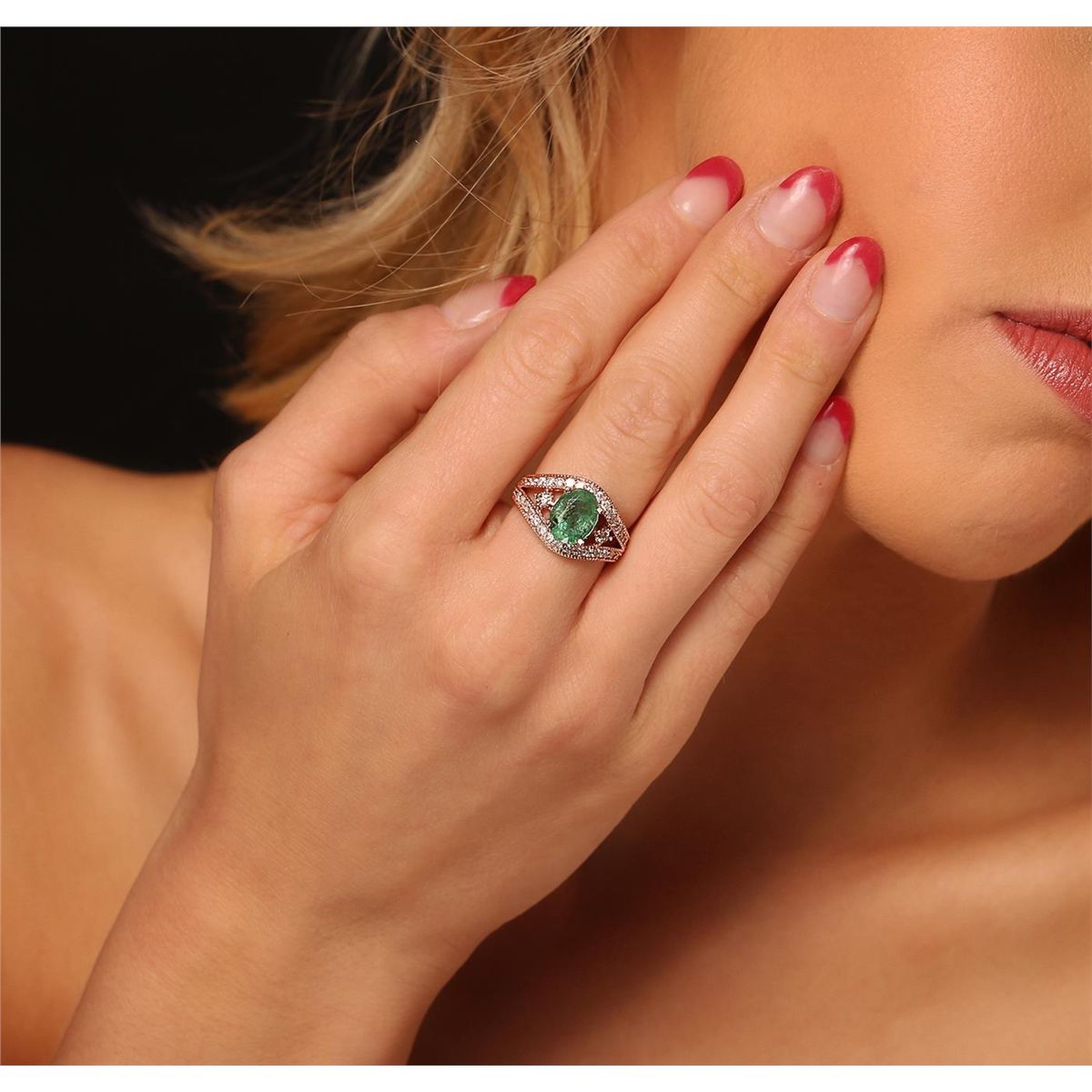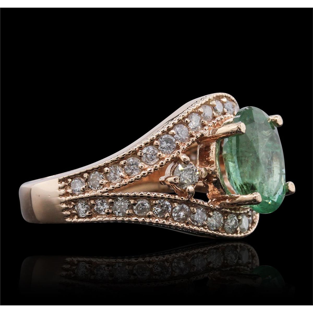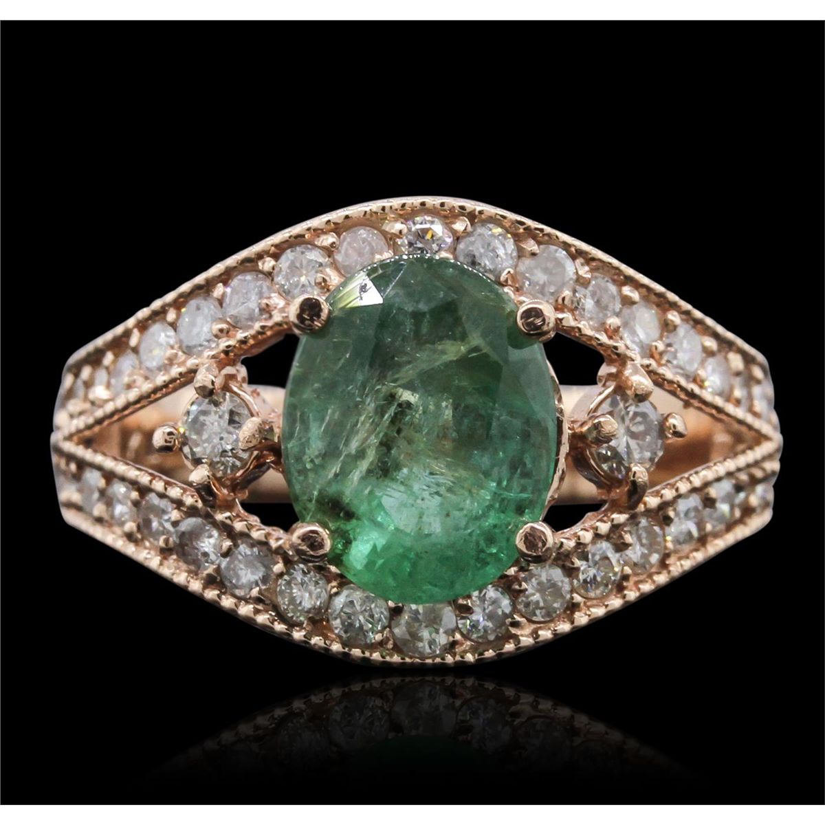 One electronically tested 14KT rose gold ladies cast emerald and diamond ring. Condition is new, good workmanship. The featured emerald is accented by a single diamond on either side supported by mirroring diamond ribbons, completed by a three millimeter wide band. Bright polish finish with milgrain detailing throughout. Identified with markings of "K14". Containing: One prong set oval mixed cut natural emerald, measuring 9.45 x 7.35 x 4.75mm, 10% bulge factor, approximate weight of 2.01ct, clarity is heavily included, type III, medium, very slightly grayish, very slightly bluish green color, (GIA vslbG 5/3), cut is good. Transmitting light with a minimum of distortion, transparent. Naturally occurring internal & external characteristics are present. Indications of oil residue. Graded in the setting. Two prong set round brilliant cut diamonds, measuring 2.50 - 2.40 x 1.47mm (depth est.) approximate total weight of 2 Stones = 0.13ct. Graded in the setting. Clarity I-1 Color I - J Thirty-Eight bead set round brilliant cut diamonds, measuring 1.70 - 1.60 x 0.99mm (depth est.) approximate total weight of 38 Stones = 0.71ct. Graded in the setting. Clarity SI-2 to I-2 Color H - J Total Weight of Colored Stones 2.01ct. Total Weight of Diamonds 0.84ct. Total Weight of Ring 5.80 grams. AIG Appraised at $4,260.00.