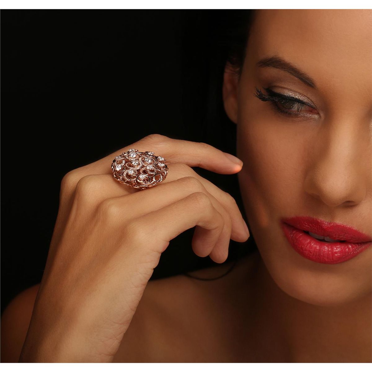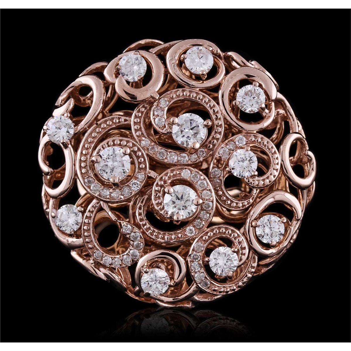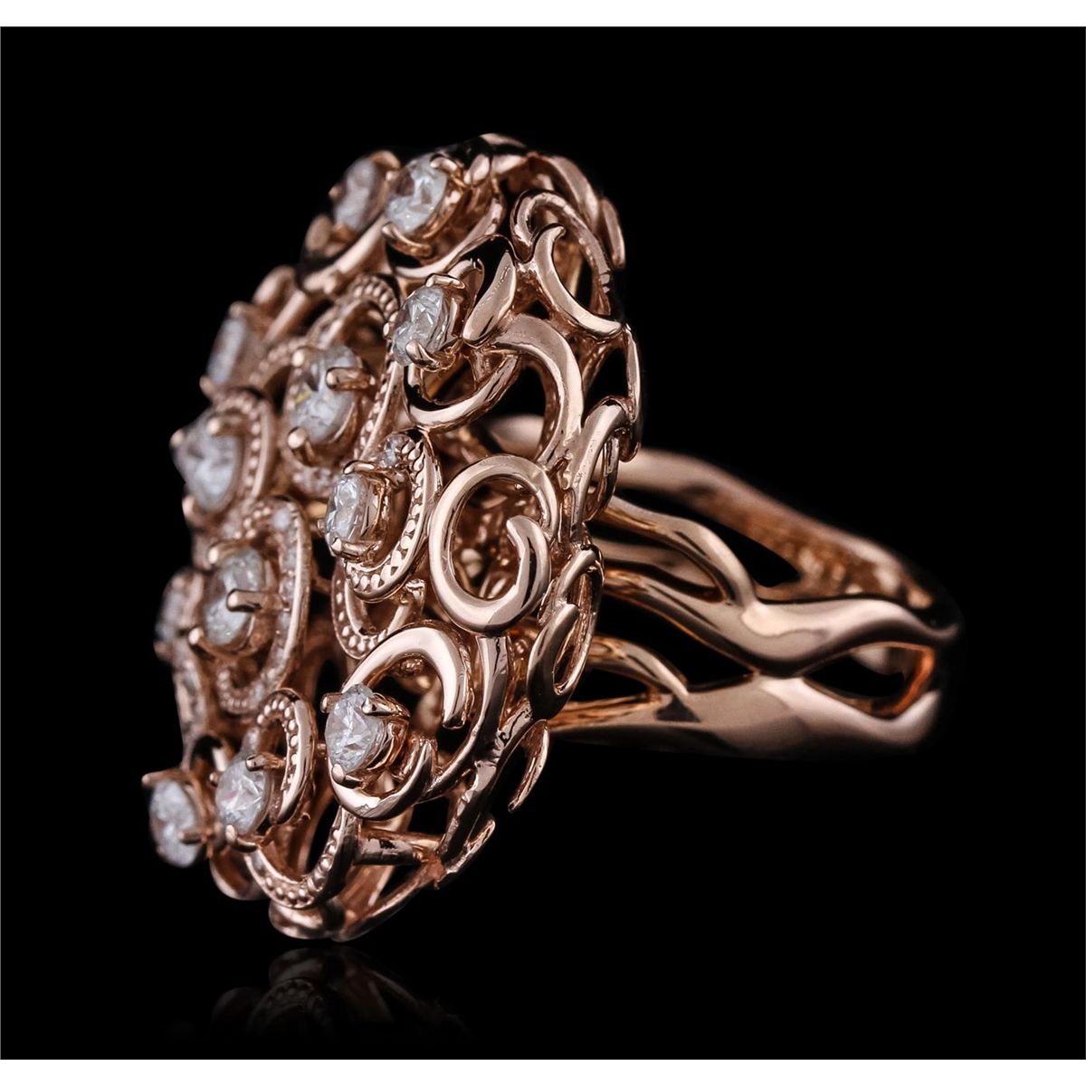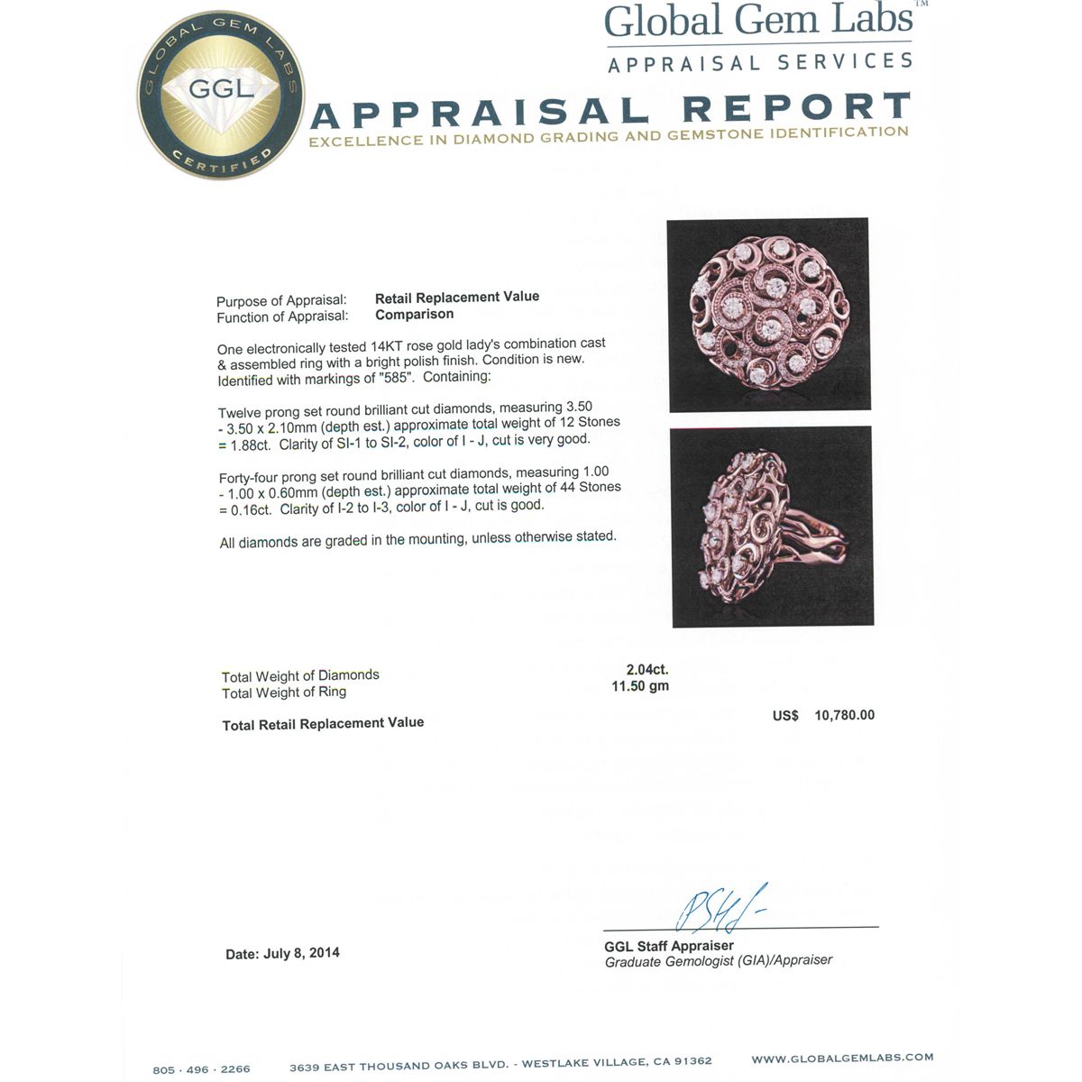 One electronically tested 14KT rose gold Ladies combination cast & assembled ring with a bright polish finish. Condition is new. Identified with markings of "585". Containing: Twelve prong set round brilliant cut diamonds, measuring 3.50 - 3.50 x 2.10mm (depth est.) approximate. Total Weight of 12 Stones = 1.88ct. Clarity: SI-1 to SI-2. Color: I - J, Cut is Very Good. Forty-Four prong set round brilliant cut diamonds, measuring 1.00 - 1.00 x 0.60mm (depth est.) approximate. Total Weight of 44 Stones = 0.16ct. Clarity: I-2 to I-3. Color: I - J, Cut is Good. All diamonds are graded in the mounting, unless otherwise stated. Total Weight of Diamonds 2.04ct. Total Weight of Ring 11.50 grams. GGL Appraised at $10,780.00.