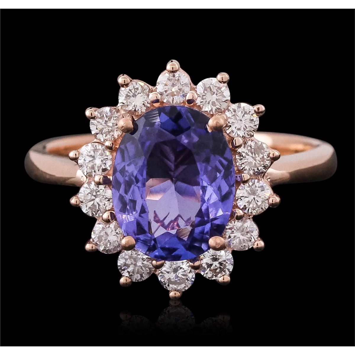 One electronically tested 14KT rose gold ladies combination cast & assembled tanzanite and diamond ring with a flat shank with a bright polish finish. Identified with markings of "14K". Condition is new. Containing: One prong set oval modified brilliant cut natural tanzanite, measuring 10.47 x 7.84 x 3.66mm, approximate weight of 2.06ct., clarity is eye clean, type I, medium, moderately strong, bluish violet color, (GIA bV 5/4), cut is good. Fourteen prong set round brilliant cut diamonds, measuring 2.10 - 2.10 x 1.26mm (depth est.) approximate total weight of 14 Stones = 0.48ct. Clarity: SI-1 to I-1. Color: J - K, Cut is Good. Colored gemstones are presumed to have been subjected to commonly used enhancement processes. All diamonds and colored gemstones are graded in the mounting, unless otherwise stated total weight of Colored Stones 2.06ct. Total Weight of Diamonds 0.48ct. Total Weight of Ring 4.10 grams. GGL Appraised at $5,555.00.