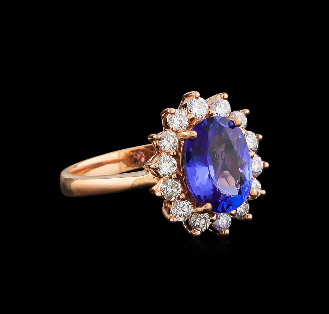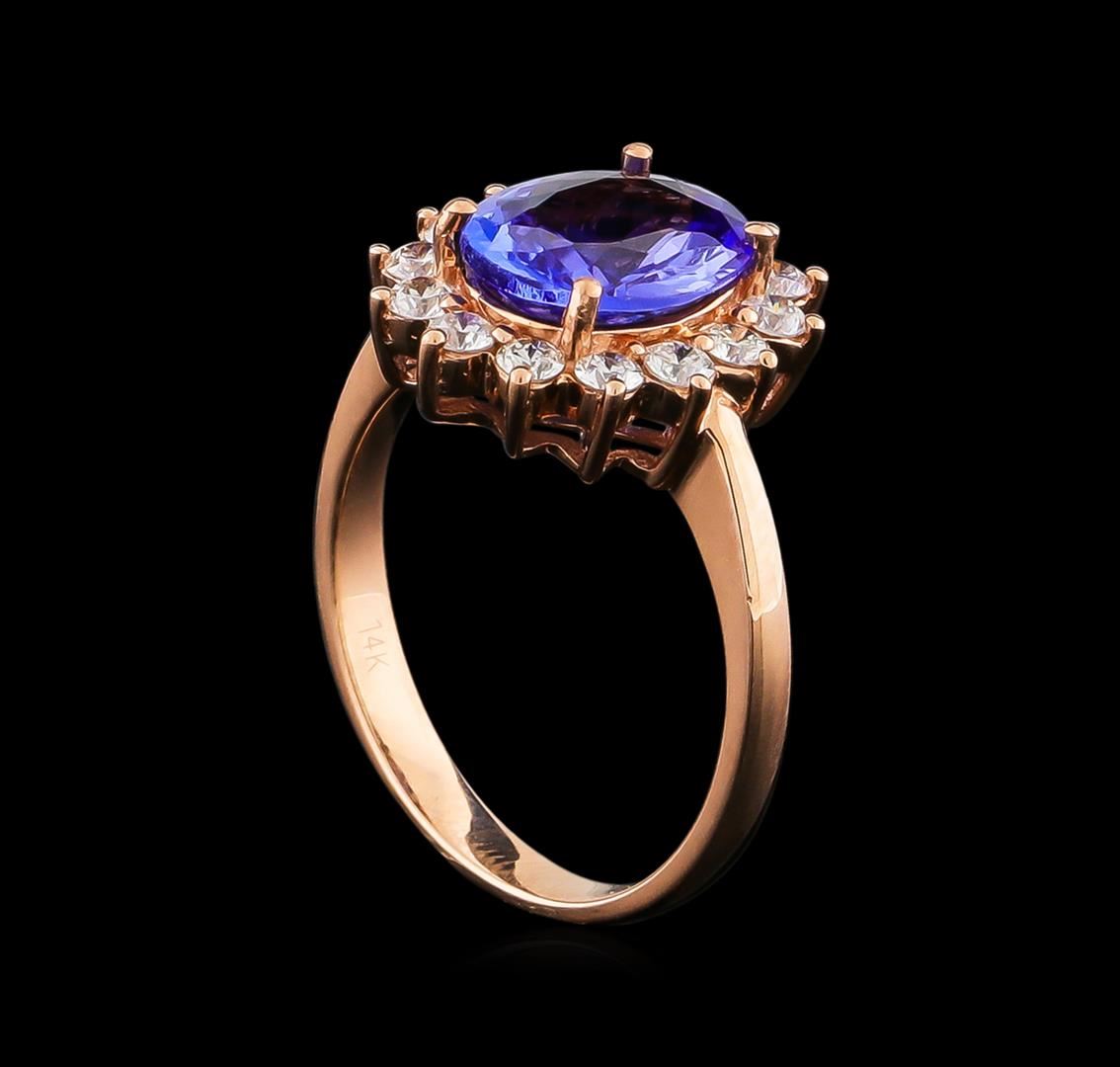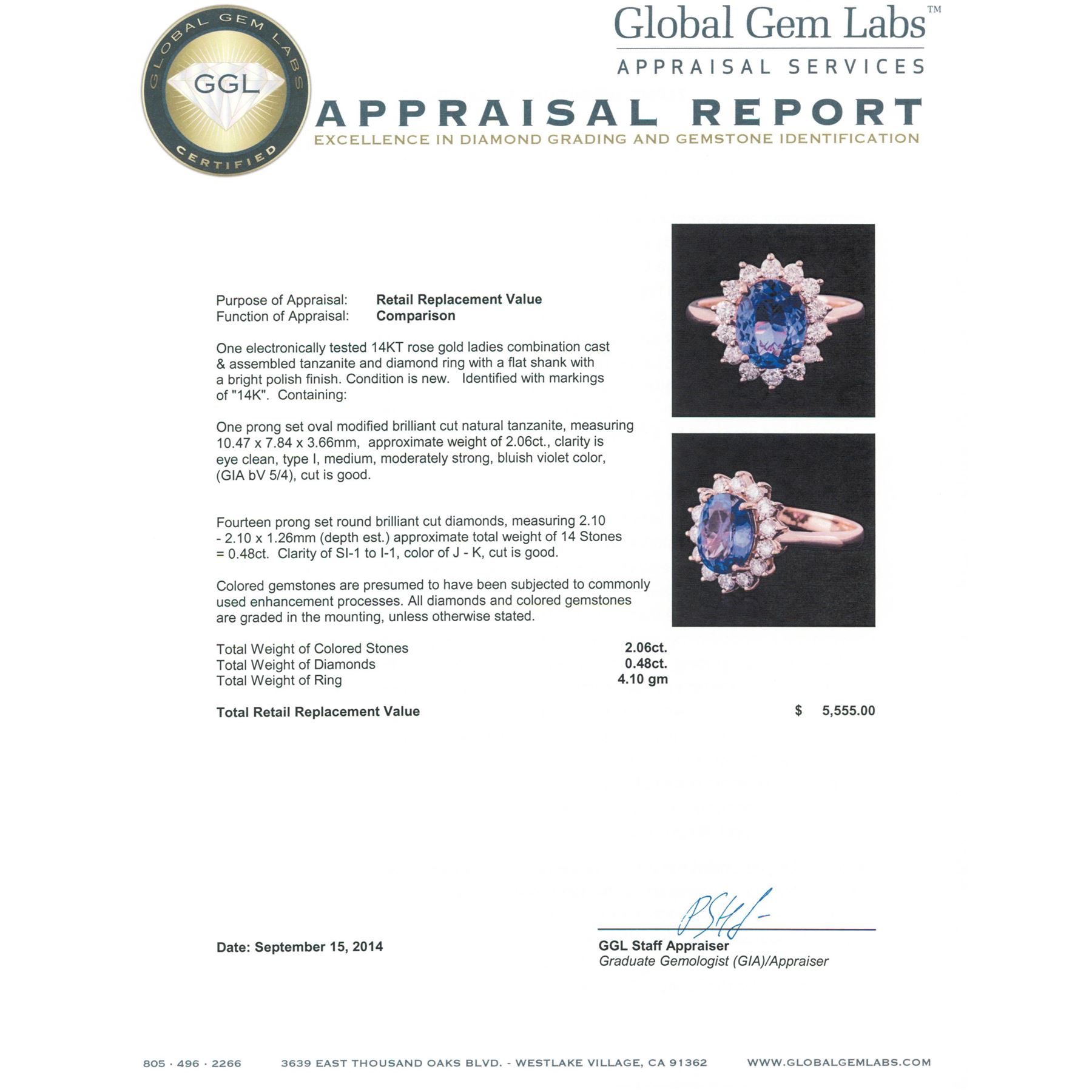 One electronically tested 14KT rose gold ladies combination cast & assembled tanzanite and diamond ring with a flat shank with a bright polish finish. Identified with markings of "14K". Condition is new. Containing: One prong set oval modified brilliant cut natural tanzanite, measuring 10.47 x 7.84 x 3.66mm, approximate weight of 2.06ct., clarity is eye clean, type I, medium, moderately strong, bluish violet color, (GIA bV 5/4), cut is good. Fourteen prong set round brilliant cut diamonds, measuring 2.10 - 2.10 x 1.26mm (depth est.) approximate total weight of 14 Stones = 0.48ct. Clarity: SI-1 to I-1. Color: J - K, Cut is Good. Colored gemstones are presumed to have been subjected to commonly used enhancement processes. All diamonds and colored gemstones are graded in the mounting, unless otherwise stated total weight of Colored Stones 2.06ct. Total Weight of Diamonds 0.48ct. Total Weight of Ring 4.10 grams. GGL Appraised at $5,555.00.