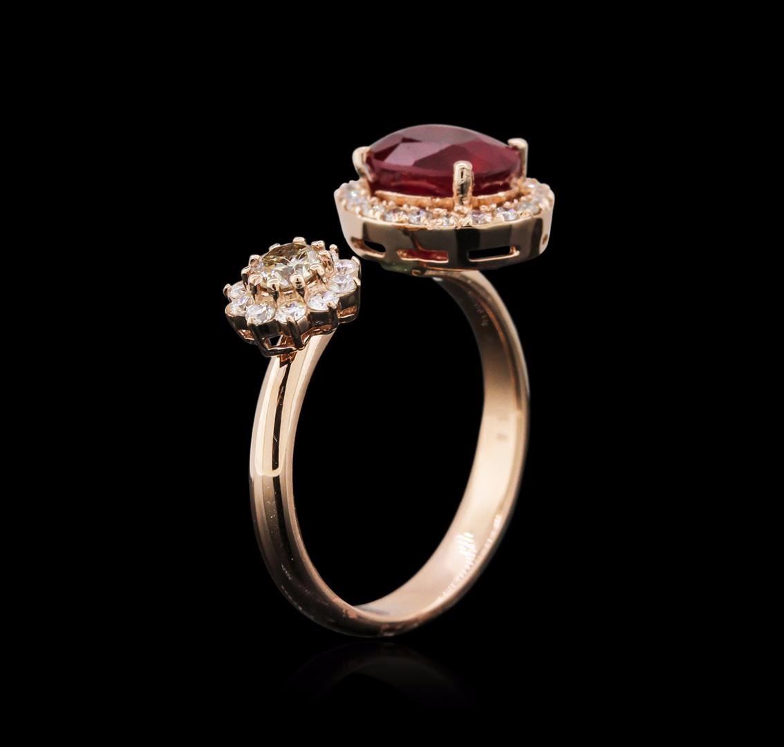 One electronically tested 14KT rose gold ladies cast ruby and diamond ring with a half round shank with a bright polish finish. Identified with markings of "K14". Condition is new. Containing: One prong set oval modified brilliant cut natural ruby, measuring 8.03 x 6.07 x 4.25mm, exact weight 2.06ct., clarity is moderately included, type II, medium, moderately strong, strongly purplish red color, (GIA stpR 5/4), cut is good. One prong set round brilliant cut diamond, measuring 3.60 - 3.60 x 2.16mm (depth est.) exact weight 0.19ct. Clarity: SI-2, Cut is Good. Ten prong set round brilliant cut diamonds, measuring 1.30 - 1.30 x 0.78mm (depth est.) approximate total weight of 10 Stones = 0.13ct. Clarity: SI-2 to I-2. Color: I - J, Cut is Good. Twenty prong set round brilliant cut diamonds, measuring 1.10 - 1.10 x 0.66mm (depth est.) approximate total weight of 20 Stones = 0.13ct. Clarity: SI-1 to I-1. Color: H - I, Cut is Good. All diamonds and colored gemstones are graded in the mounting, unless otherwise stated. Colored gemstones are presumed to have been subjected to commonly used enhancement processes. Total Weight of Colored Stones 2.06ct. Total Weight of Diamonds 0.45ct. Total Weight of Ring 3.90 grams. GGL Appraised at $1,850.00.