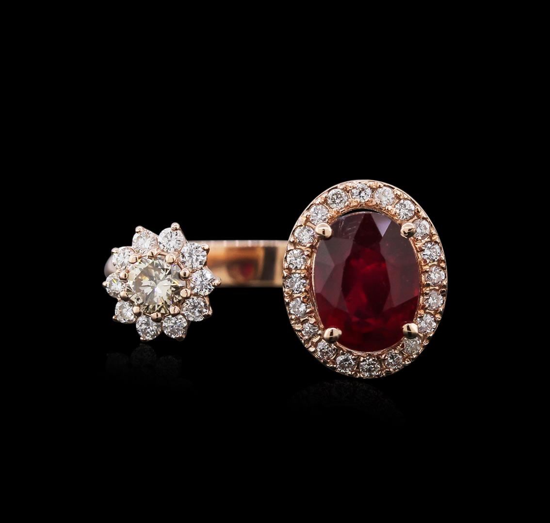 One electronically tested 14KT rose gold ladies cast ruby and diamond ring with a half round shank with a bright polish finish. Identified with markings of "K14". Condition is new. Containing: One prong set oval modified brilliant cut natural ruby, measuring 8.03 x 6.07 x 4.25mm, exact weight 2.06ct., clarity is moderately included, type II, medium, moderately strong, strongly purplish red color, (GIA stpR 5/4), cut is good. One prong set round brilliant cut diamond, measuring 3.60 - 3.60 x 2.16mm (depth est.) exact weight 0.19ct. Clarity: SI-2, Cut is Good. Ten prong set round brilliant cut diamonds, measuring 1.30 - 1.30 x 0.78mm (depth est.) approximate total weight of 10 Stones = 0.13ct. Clarity: SI-2 to I-2. Color: I - J, Cut is Good. Twenty prong set round brilliant cut diamonds, measuring 1.10 - 1.10 x 0.66mm (depth est.) approximate total weight of 20 Stones = 0.13ct. Clarity: SI-1 to I-1. Color: H - I, Cut is Good. All diamonds and colored gemstones are graded in the mounting, unless otherwise stated. Colored gemstones are presumed to have been subjected to commonly used enhancement processes. Total Weight of Colored Stones 2.06ct. Total Weight of Diamonds 0.45ct. Total Weight of Ring 3.90 grams. GGL Appraised at $1,850.00.