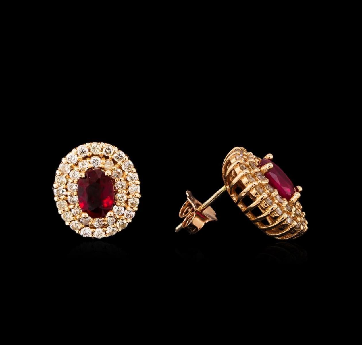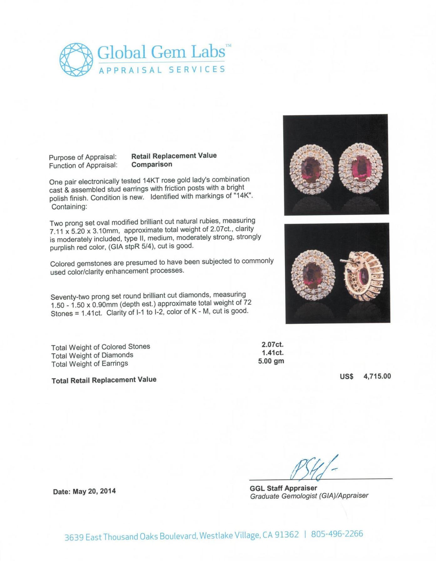 One pair electronically tested 14KT rose gold Ladies combination cast & assembled stud earrings with friction posts with a bright polish finish. Condition is new. Identified with markings of "14K". Containing: Two prong set oval modified brilliant cut natural rubies, measuring 7.11 x 5.20 x 3.10mm, approximate. Total Weight of 2.07ct., clarity is moderately included, type II, medium, moderately strong, strongly purplish red color, (GIA stpR 5/4), cut is good. Colored gemstones are presumed to have been subjected to commonly used color/clarity enhancement processes. Seventy-Two prong set round brilliant cut diamonds, measuring 1.50 - 1.50 x 0.90mm (depth est.) approximate. Total Weight of 72 Stones = 1.41ct. Clarity: I-1 to I-2. Color: K - M, Cut is Good. Total Weight of Colored Stones 2.07ct. Total Weight of Diamonds 1.41ct. Total Weight of Earrings 5.00 grams. GGL Appraised.