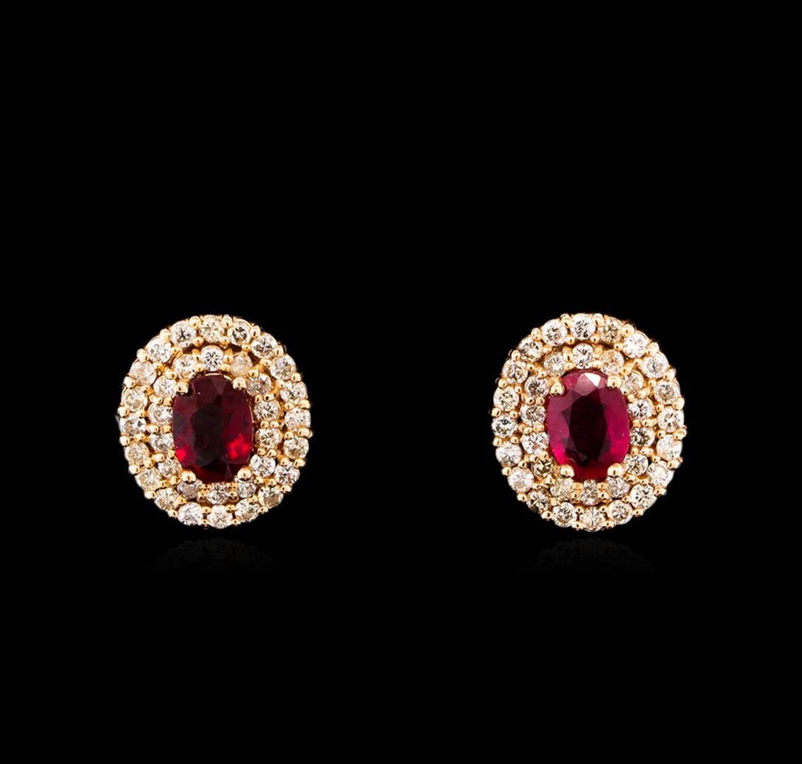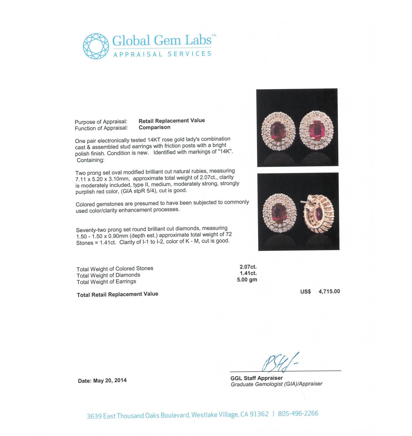 One pair electronically tested 14KT rose gold Ladies combination cast & assembled stud earrings with friction posts with a bright polish finish. Condition is new. Identified with markings of "14K". Containing: Two prong set oval modified brilliant cut natural rubies, measuring 7.11 x 5.20 x 3.10mm, approximate. Total Weight of 2.07ct., clarity is moderately included, type II, medium, moderately strong, strongly purplish red color, (GIA stpR 5/4), cut is good. Colored gemstones are presumed to have been subjected to commonly used color/clarity enhancement processes. Seventy-Two prong set round brilliant cut diamonds, measuring 1.50 - 1.50 x 0.90mm (depth est.) approximate. Total Weight of 72 Stones = 1.41ct. Clarity: I-1 to I-2. Color: K - M, Cut is Good. Total Weight of Colored Stones 2.07ct. Total Weight of Diamonds 1.41ct. Total Weight of Earrings 5.00 grams. GGL Appraised.