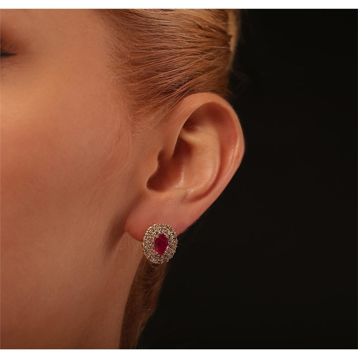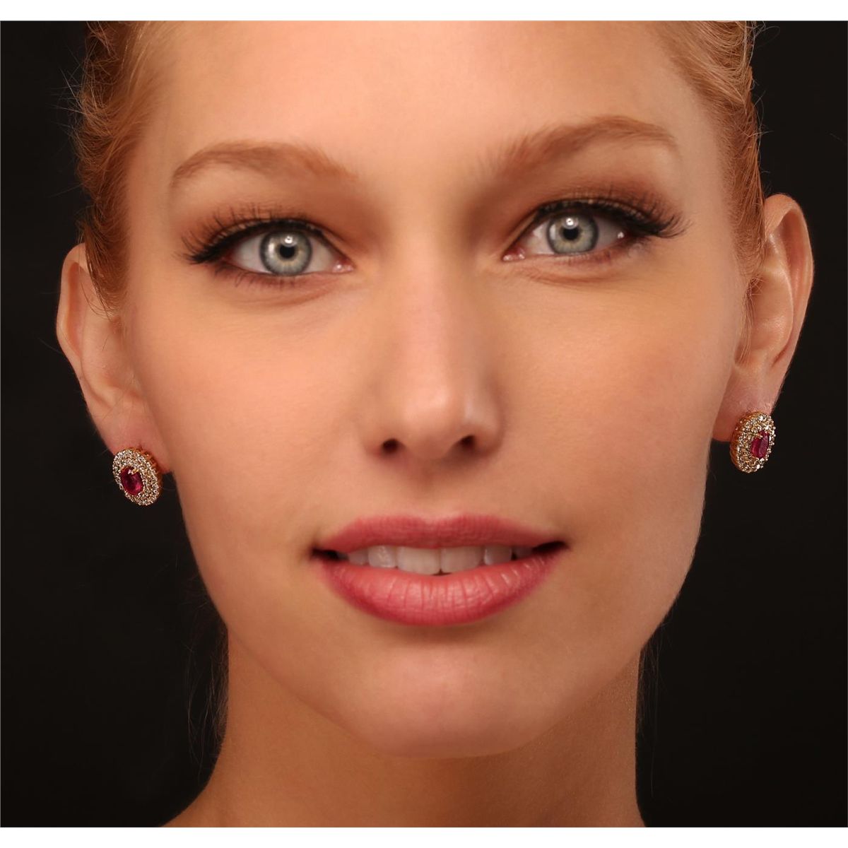 One pair electronically tested 14KT rose gold Ladies combination cast & assembled stud earrings with friction posts with a bright polish finish. Condition is new. Identified with markings of "14K". Containing: Two prong set oval modified brilliant cut natural rubies, measuring 7.11 x 5.20 x 3.10mm, approximate. Total Weight of 2.07ct., clarity is moderately included, type II, medium, moderately strong, strongly purplish red color, (GIA stpR 5/4), cut is good. Colored gemstones are presumed to have been subjected to commonly used color/clarity enhancement processes. Seventy-Two prong set round brilliant cut diamonds, measuring 1.50 - 1.50 x 0.90mm (depth est.) approximate. Total Weight of 72 Stones = 1.41ct. Clarity: I-1 to I-2. Color: K - M, Cut is Good. Total Weight of Colored Stones 2.07ct. Total Weight of Diamonds 1.41ct. Total Weight of Earrings 5.00 grams. GGL Appraised at $4,715.00.