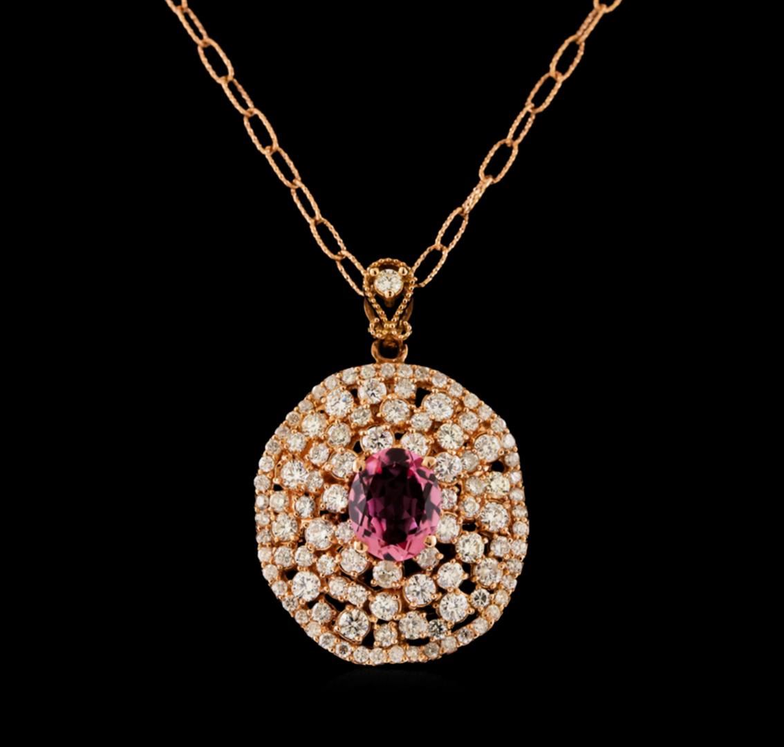One electronically tested 14KT rose gold ladies cast & assembled pink tourmaline and diamond pendant with chain. The pendant features a pink tourmaline set within elaborate diamond bezels, completed by a diamond set bail. The pendant is supported by an eighteen inch length 14KT rose gold link chain with milgrain detailing, terminating in a lobster claw clasp. Bright polish finish with milgrain detailing. Identified with markings of "K14". Condition is new, good workmanship. Containing: One prong set oval mixed cut natural pink tourmaline, measuring 9.90 x 8.00 x 4.15mm, 6% bulge factor, approximate weight of 2.16ct., clarity is eye clean, medium dark, moderately strong, pink color, (GIA Pk 6/4), cut is good. Transmitting light with no distortion, transparent. Graded in the setting. Forty-One prong set round brilliant cut diamonds, measuring 2.70 - 2.20 x 1.47mm (depth est.) approximate total weight of 41 Stones = 2.32ct. Graded in the setting. Clarity: SI-1 to I-1. Color: G - I Seventeen prong set round brilliant cut diamonds, measuring 1.90 - 1.70 x 1.08mm (depth est.) approximate total weight of 17 Stones = 0.45ct. Graded in the setting. Clarity: SI-1 to I-1. Color: G - I Forty-Eight prong set round brilliant cut diamonds, measuring 1.50 - 1.40 x 0.87mm (depth est.) approximate total weight of 48 Stones = 0.64ct. Graded in the setting. Clarity: SI-1 to I-1. Color: G - I. Total Weight of Colored Stones 2.16ct. Total Weight of Diamonds 3.41ct. Total Weight of Pendant With Chain 12.92 grams. AIG Appraised at $12,795.00.