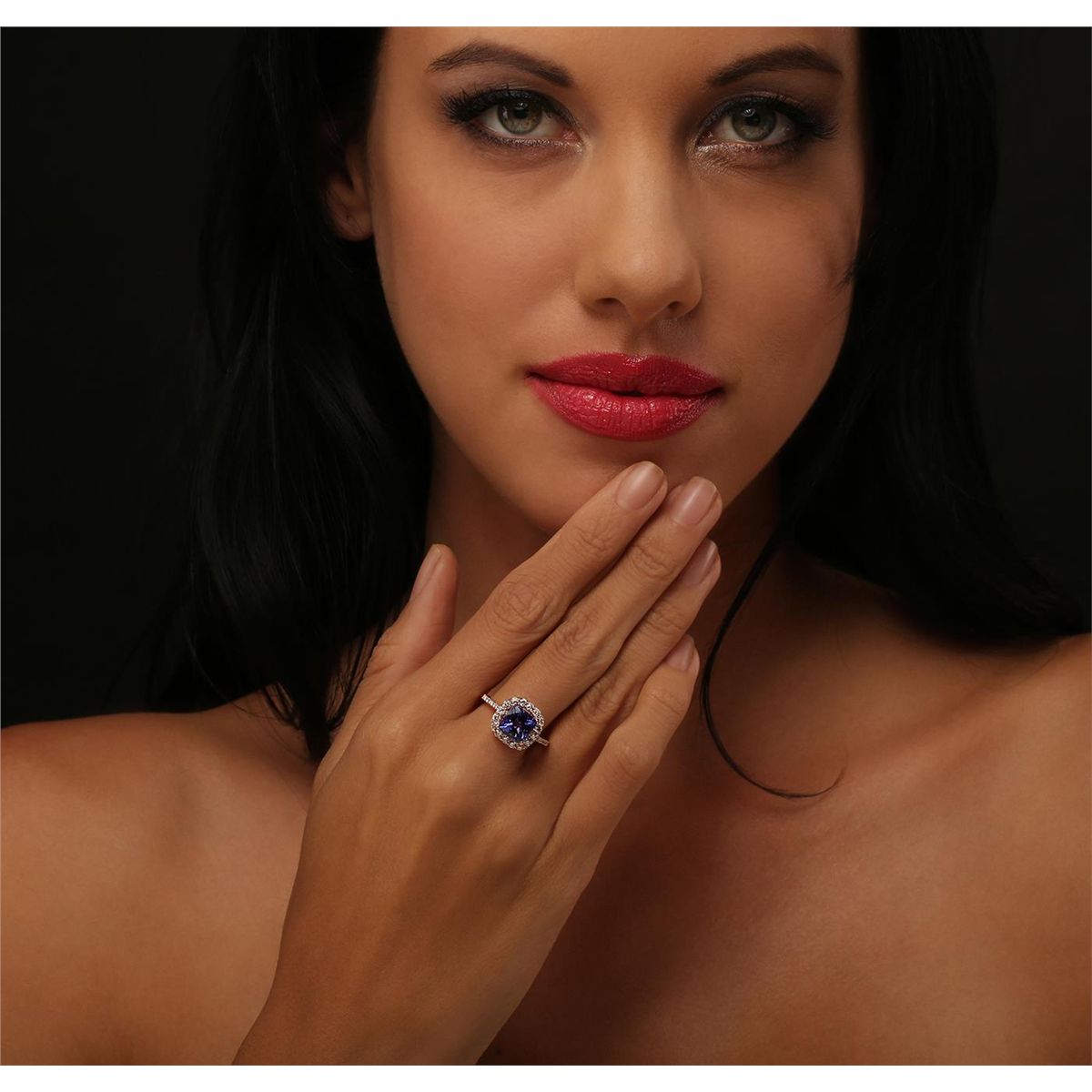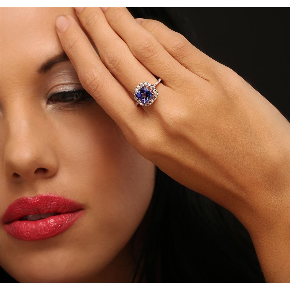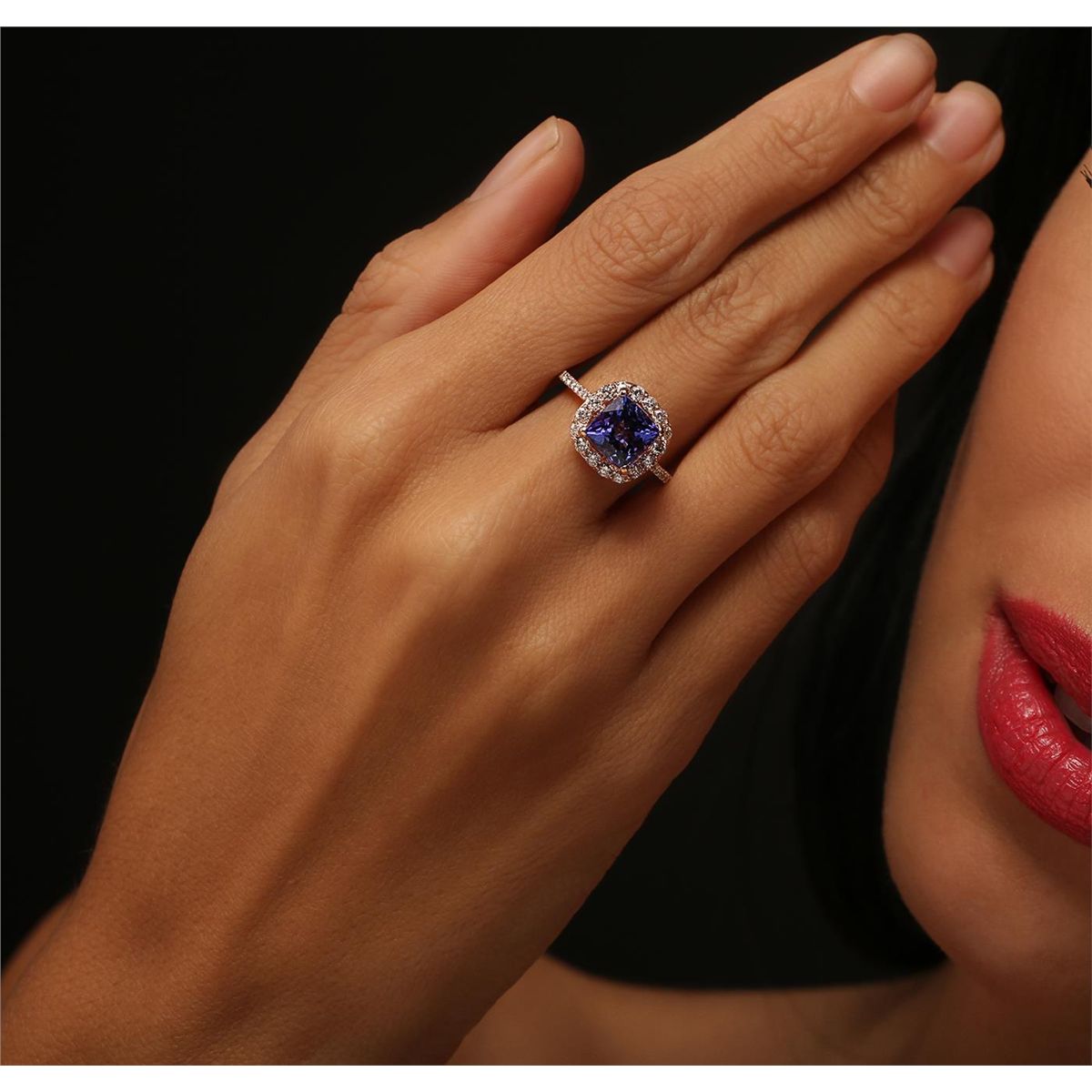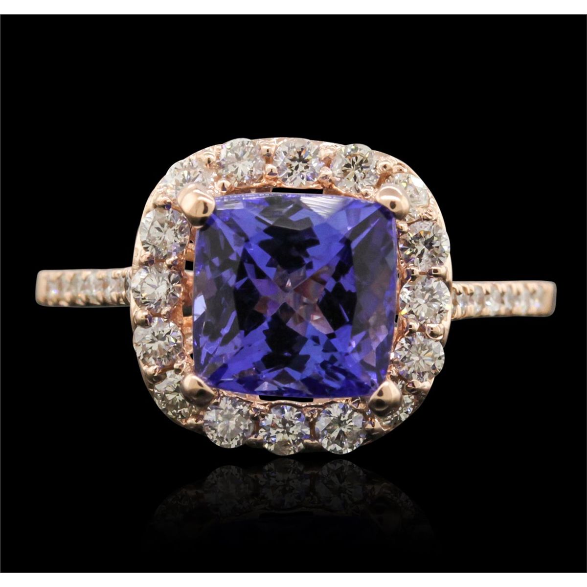 One electronically tested 14KT rose gold Ladies combination cast & assembled ring with a bright polish finish. Condition is new. Identified with markings of "14K". Containing: One prong set square cushion modified brilliant cut natural tanzanite, measuring 7.50 x 7.50 x 4.88mm, approximate. Total Weight of 2.16ct., clarity is eye clean, type I, medium, moderately strong, bluish violet color, (GIA bV 5/4), cut is good. Thirty prong set round brilliant cut diamonds, measuring 1.80 - 1.10 x 0.87mm (depth est.) approximate. Total Weight of 30 Stones = 0.33ct. Clarity: I-1 to I-2. Color: J - K, Cut is Good. Colored gemstones are presumed to have been subjected to commonly used enhancement processes. All diamonds and colored gemstones are graded in the mounting, unless otherwise stated. Total Weight of Colored Stones 2.16ct. Total Weight of Diamonds 0.33ct. Total Weight of Ring 3.50 grams. GGL Appraised at $4,790.00.