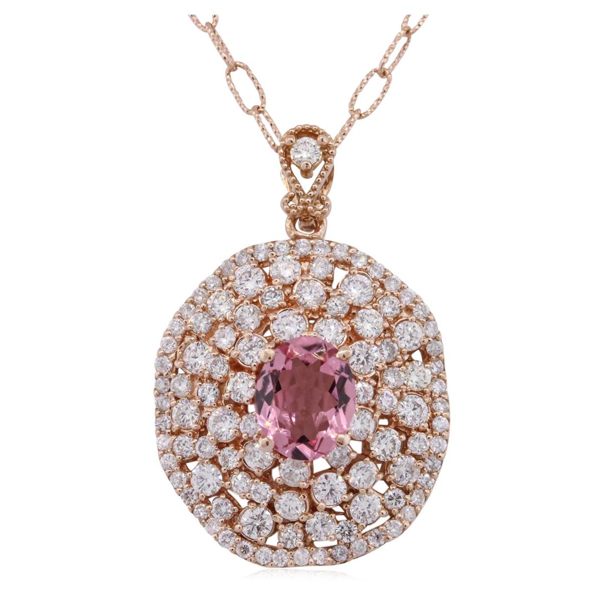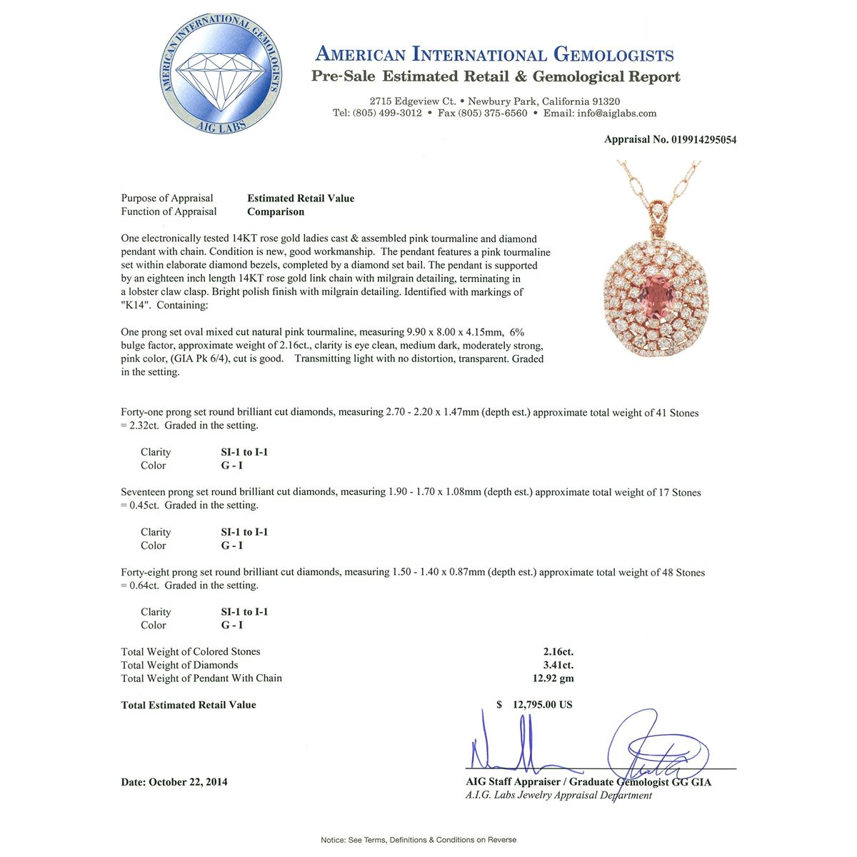 One electronically tested 14KT rose gold ladies cast & assembled pink tourmaline and diamond pendant with chain. The pendant features a pink tourmaline set within elaborate diamond bezels, completed by a diamond set bail. The pendant is supported by an eighteen inch length 14KT rose gold link chain with milgrain detailing, terminating in a lobster claw clasp. Bright polish finish with milgrain detailing. Identified with markings of "K14". Condition is new, good workmanship. Containing: One prong set oval mixed cut natural pink tourmaline, measuring 9.90 x 8.00 x 4.15mm, 6% bulge factor, approximate weight of 2.16ct., clarity is eye clean, medium dark, moderately strong, pink color, (GIA Pk 6/4), cut is good. Transmitting light with no distortion, transparent. Graded in the setting. Forty-One prong set round brilliant cut diamonds, measuring 2.70 - 2.20 x 1.47mm (depth est.) approximate total weight of 41 Stones = 2.32ct. Graded in the setting. Clarity: SI-1 to I-1. Color: G - I Seventeen prong set round brilliant cut diamonds, measuring 1.90 - 1.70 x 1.08mm (depth est.) approximate total weight of 17 Stones = 0.45ct. Graded in the setting. Clarity: SI-1 to I-1. Color: G - I Forty-Eight prong set round brilliant cut diamonds, measuring 1.50 - 1.40 x 0.87mm (depth est.) approximate total weight of 48 Stones = 0.64ct. Graded in the setting. Clarity: SI-1 to I-1. Color: G - I. Total Weight of Colored Stones 2.16ct. Total Weight of Diamonds 3.41ct. Total Weight of Pendant With Chain 12.92 grams. AIG Appraised at $12,795.00.
