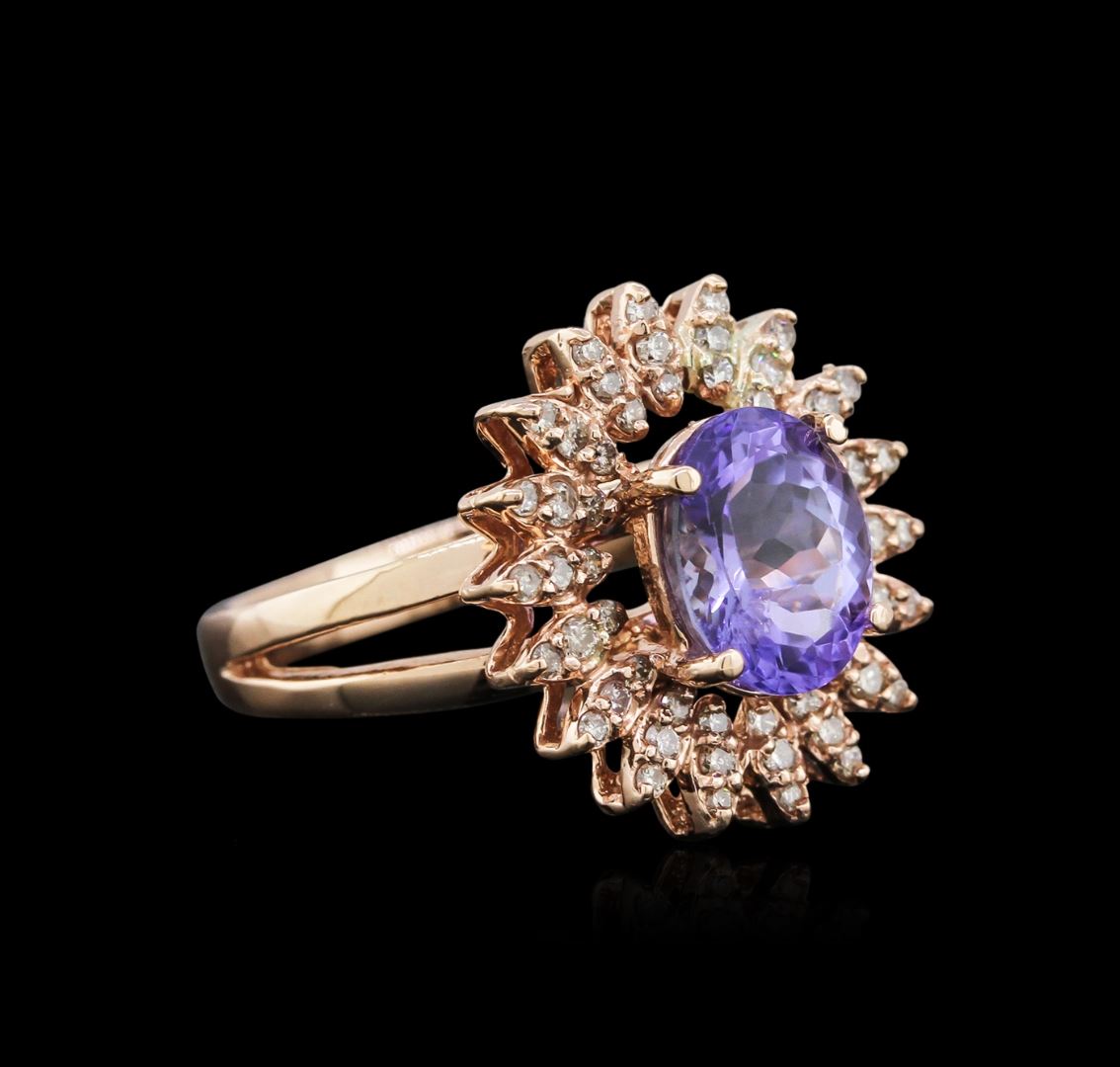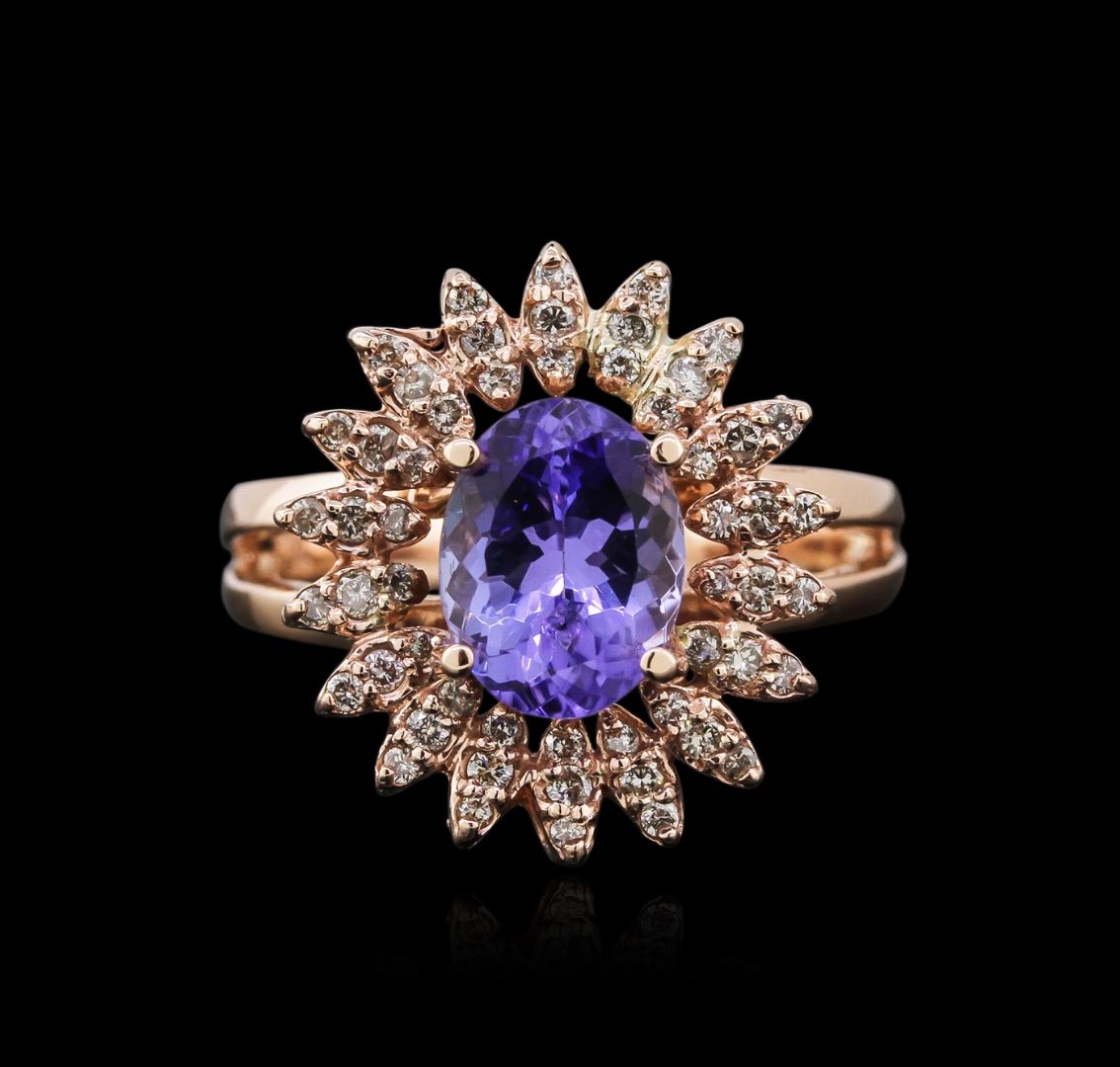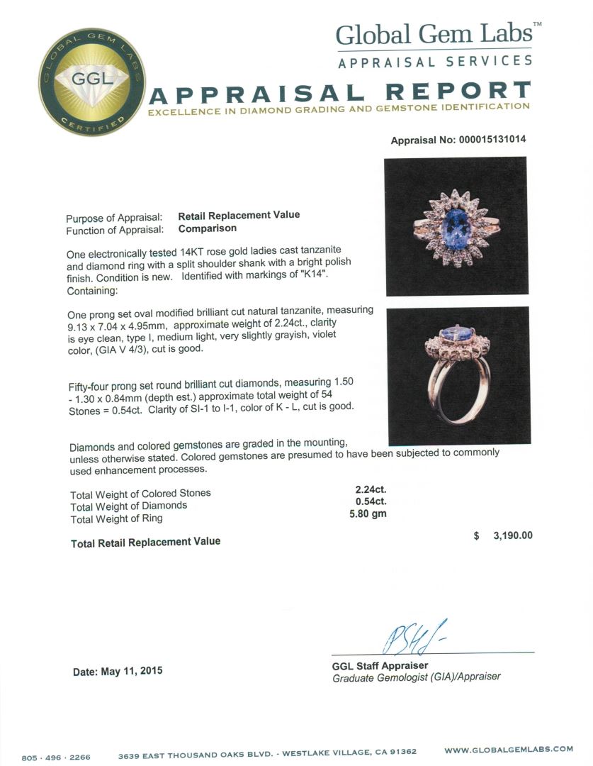 One electronically tested 14KT rose gold ladies cast tanzanite and diamond ring with a split shoulder shank with a bright polish finish. Identified with markings of "K14". Condition is new. Containing: One prong set oval modified brilliant cut natural tanzanite, measuring 9.13 x 7.04 x 4.95mm, approximate weight of 2.24ct., clarity is eye clean, type I, medium light, very slightly grayish, violet color, (GIA V 4/3), cut is good. Fifty-Four prong set round brilliant cut diamonds, measuring 1.50 - 1.30 x 0.84mm (depth est.) approximate total weight of 54 Stones = 0.54ct. Clarity: SI-1 to I-1. Color: K - L, Cut is Good. Diamonds and colored gemstones are graded in the mounting, unless otherwise stated. Colored gemstones are presumed to have been subjected to commonly used enhancement processes. Total Weight of Colored Stones 2.24ct. Total Weight of Diamonds 0.54ct. Total Weight of Ring 5.80 grams. GGL Appraised at $3,190.00.