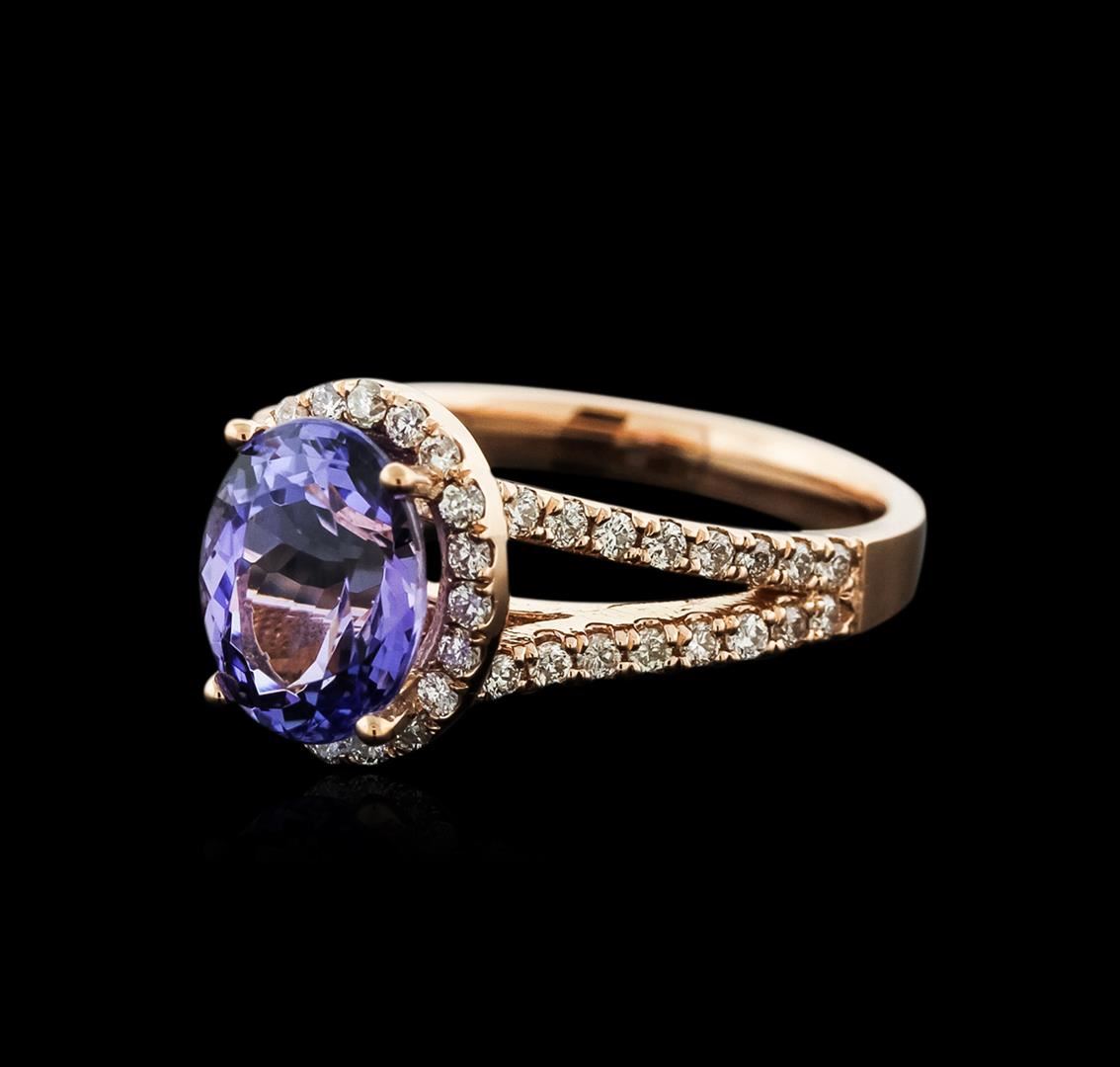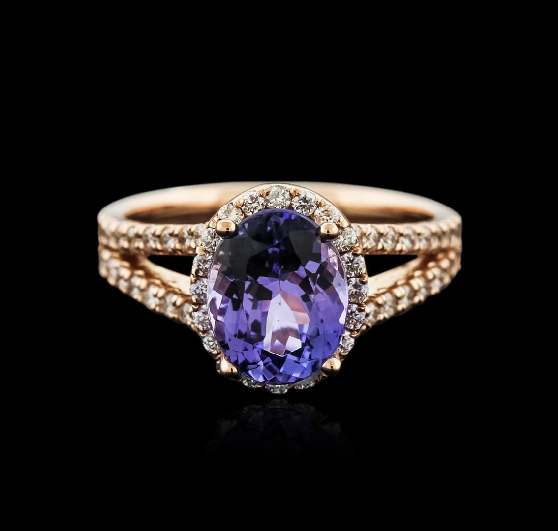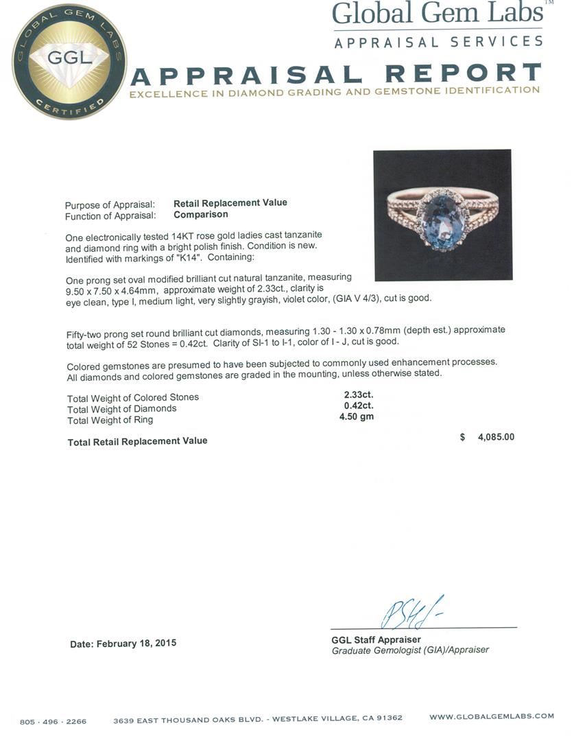 One electronically tested 14KT rose gold ladies cast tanzanite and diamond ring with a bright polish finish. Identified with markings of "K14". Condition is new. Containing: One prong set oval modified brilliant cut natural tanzanite, measuring 9.50 x 7.50 x 4.64mm, approximate weight of 2.33ct., clarity is eye clean, type I, medium light, very slightly grayish, violet color, (GIA V 4/3), cut is good. Fifty-Two prong set round brilliant cut diamonds, measuring 1.30 - 1.30 x 0.78mm (depth est.) approximate total weight of 52 Stones = 0.42ct. Clarity: SI-1 to I-1. Color: I - J, Cut is Good. Colored gemstones are presumed to have been subjected to commonly used enhancement processes. All diamonds and colored gemstones are graded in the mounting, unless otherwise stated. Total Weight of Colored Stones 2.33ct. Total Weight of Diamonds 0.42ct. Total Weight of Ring 4.50 grams. GGL Appraised at $4,085.00.