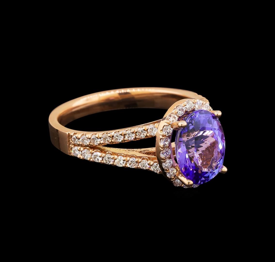 One electronically tested 14KT rose gold ladies cast tanzanite and diamond ring with a bright polish finish. Identified with markings of "K14". Condition is new. Containing: One prong set oval modified brilliant cut natural tanzanite, measuring 9.50 x 7.50 x 4.64mm, approximate weight of 2.33ct., clarity is eye clean, type I, medium light, very slightly grayish, violet color, (GIA V 4/3), cut is good. Fifty-Two prong set round brilliant cut diamonds, measuring 1.30 - 1.30 x 0.78mm (depth est.) approximate total weight of 52 Stones = 0.42ct. Clarity: SI-1 to I-1. Color: I - J, Cut is Good. Colored gemstones are presumed to have been subjected to commonly used enhancement processes. All diamonds and colored gemstones are graded in the mounting, unless otherwise stated. Total Weight of Colored Stones 2.33ct. Total Weight of Diamonds 0.42ct. Total Weight of Ring 4.50 grams. GGL Appraised at $4,085.00.