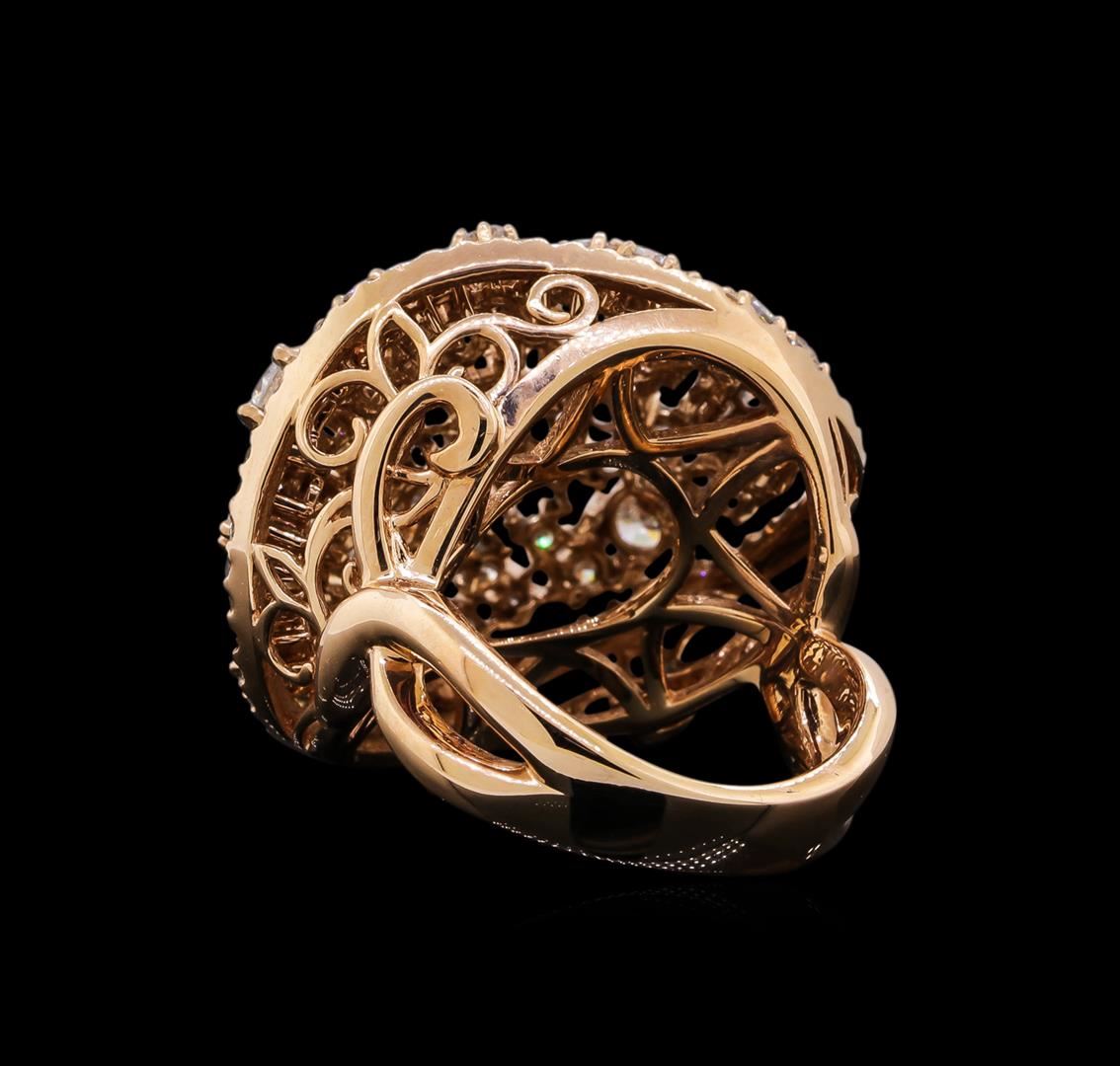 One electronically tested 14KT rose gold ladies cast diamond ring with a bright polish finish. Identified with markings of "585". Condition is new. Containing: Seven prong set round brilliant cut diamonds, measuring 3.20 - 3.20 x 1.92mm (depth est.) approximate total weight of 7 Stones = 0.84ct. Clarity: SI-1 to SI-2. Color: I - J, Cut is Good. One Hundred Twenty-Three prong set round brilliant cut diamonds, measuring 2.10 - 1.30 x 1.02mm (depth est.) approximate total weight of 123 Stones = 1.50ct. Clarity: SI-1 to I-1. Color: H - I, Cut is Good. All diamonds are graded in the mounting, unless otherwise stated. Total Weight of Diamonds 2.34ct. Total Weight of Ring 14.50 grams. GGL Appraised at $8,855.00.