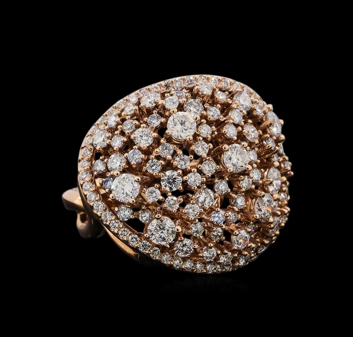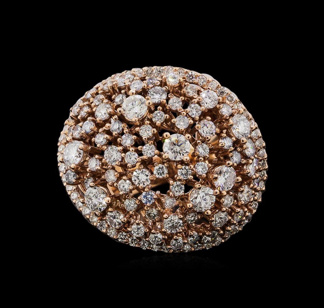 One electronically tested 14KT rose gold ladies cast diamond ring with a bright polish finish. Identified with markings of "585". Condition is new. Containing: Seven prong set round brilliant cut diamonds, measuring 3.20 - 3.20 x 1.92mm (depth est.) approximate total weight of 7 Stones = 0.84ct. Clarity: SI-1 to SI-2. Color: I - J, Cut is Good. One Hundred Twenty-Three prong set round brilliant cut diamonds, measuring 2.10 - 1.30 x 1.02mm (depth est.) approximate total weight of 123 Stones = 1.50 ct. Clarity: SI-1 to I-1. Color: H - I, Cut is Good. All diamonds are graded in the mounting, unless otherwise stated. Total Weight of Diamonds 2.34ct. Total Weight of Ring 14.50 grams. GGL Appraised.