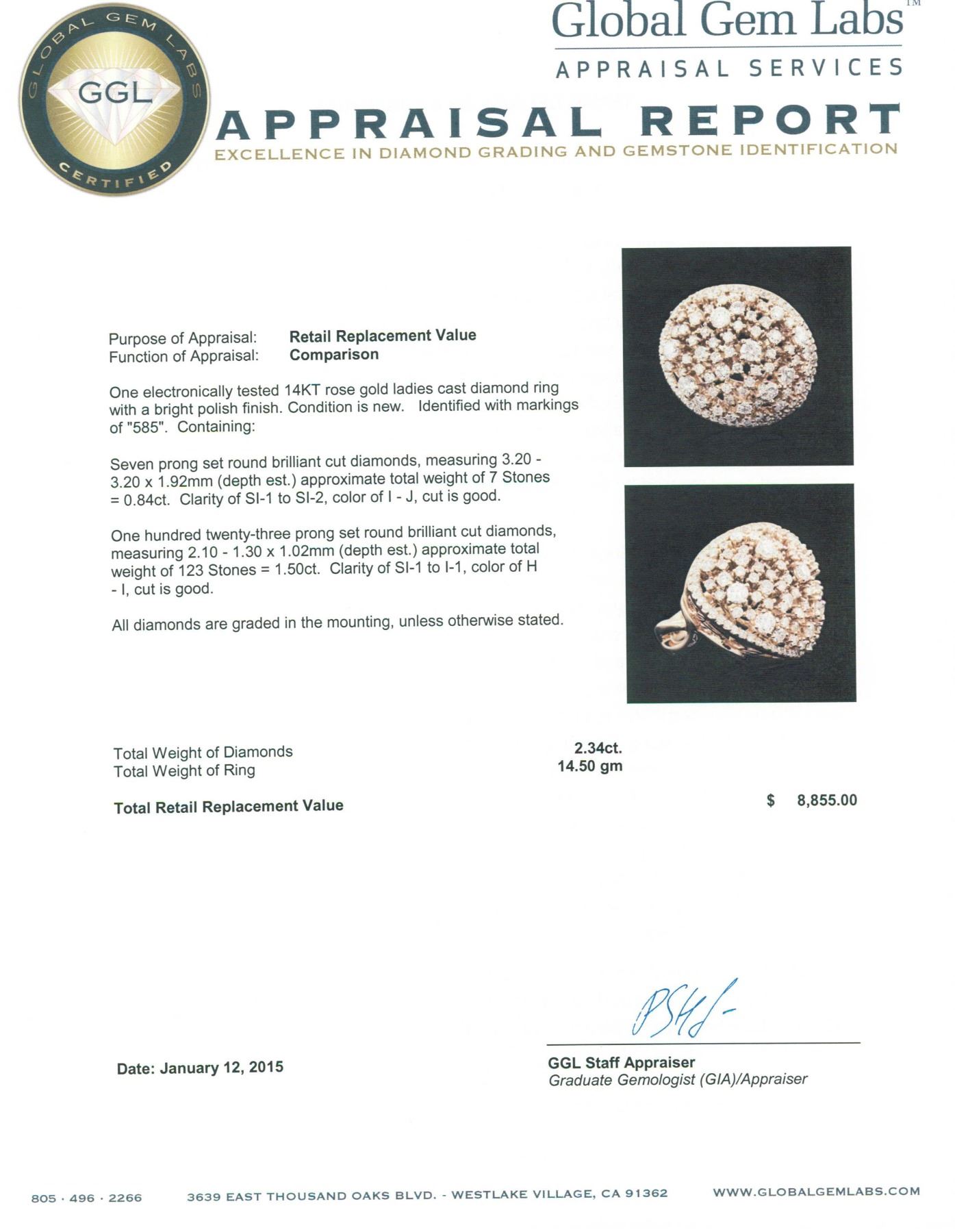 One electronically tested 14KT rose gold ladies cast diamond ring with a bright polish finish. Identified with markings of "585". Condition is new. Containing: Seven prong set round brilliant cut diamonds, measuring 3.20 - 3.20 x 1.92mm (depth est.) approximate total weight of 7 Stones = 0.84ct. Clarity: SI-1 to SI-2. Color: I - J, Cut is Good. One Hundred Twenty-Three prong set round brilliant cut diamonds, measuring 2.10 - 1.30 x 1.02mm (depth est.) approximate total weight of 123 Stones = 1.50 ct. Clarity: SI-1 to I-1. Color: H - I, Cut is Good. All diamonds are graded in the mounting, unless otherwise stated. Total Weight of Diamonds 2.34ct. Total Weight of Ring 14.50 grams. GGL Appraised.