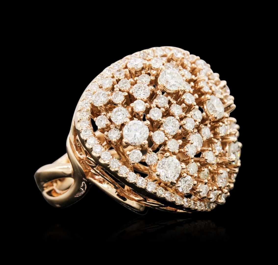 One electronically tested 14KT rose gold ladies cast diamond ring with a bright polish finish. Identified with markings of "585". Condition is new. Containing: Seven prong set round brilliant cut diamonds, measuring 3.20 - 3.20 x 1.92mm (depth est.) approximate total weight of 7 Stones = 0.84ct. Clarity: SI-1 to SI-2. Color: I - J, Cut is Good. One Hundred Twenty-Three prong set round brilliant cut diamonds, measuring 2.10 - 1.30 x 1.02mm (depth est.) approximate total weight of 123 Stones = 1.50ct. Clarity: SI-1 to I-1. Color: H - I, Cut is Good. All diamonds are graded in the mounting, unless otherwise stated. Total Weight of Diamonds 2.34ct. Total Weight of Ring 14.50 grams. GGL Appraised at $8,855.00.