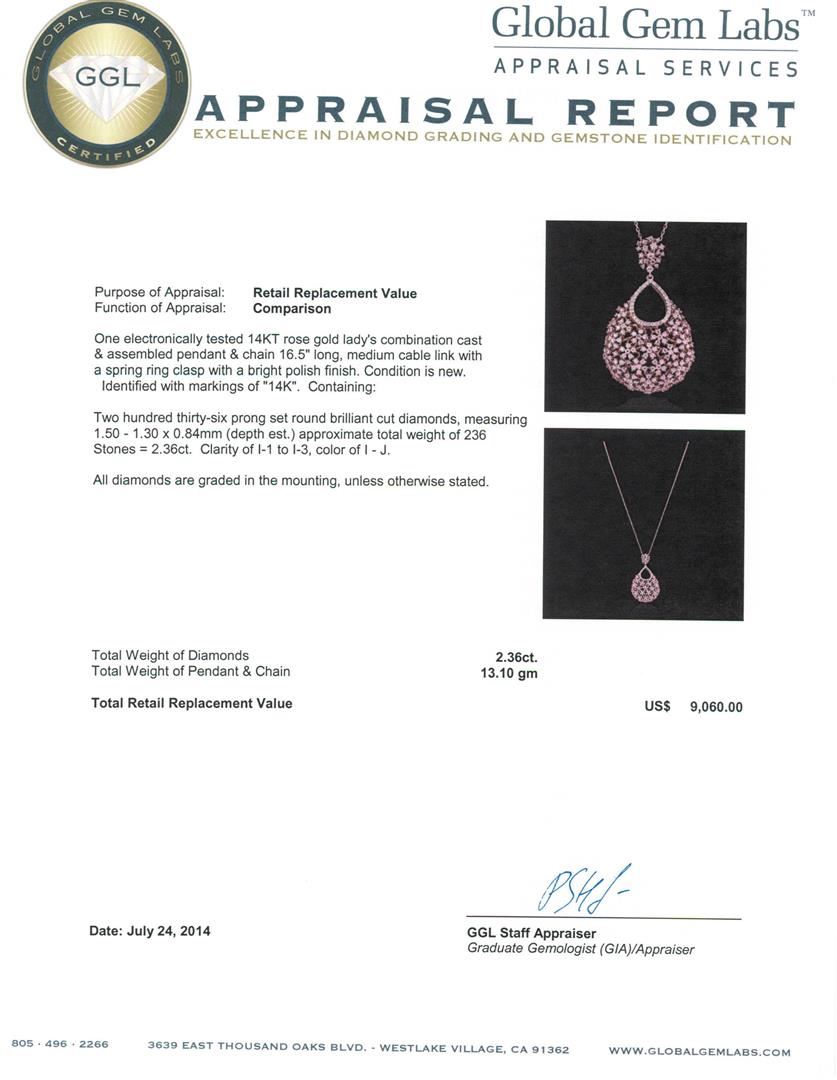 One electronically tested 14KT rose gold ladies combination cast & assembled pendant & chain 16.5" long, medium cable link with a spring ring clasp with a bright polish finish. Condition is new. Identified with markings of "14K". Containing: Two Hundred Thirty-Six prong set round brilliant cut diamonds, measuring 1.50 - 1.30 x 0.84mm (depth est.) approximate total weight of 236 Stones = 2.36ct. Clarity: I-1 to I-3. Color: I - J. All diamonds are graded in the mounting, unless otherwise stated. Total Weight of Diamonds 2.36ct. Total Weight of Pendant & Chain 13.10 grams. GGL Appraised.