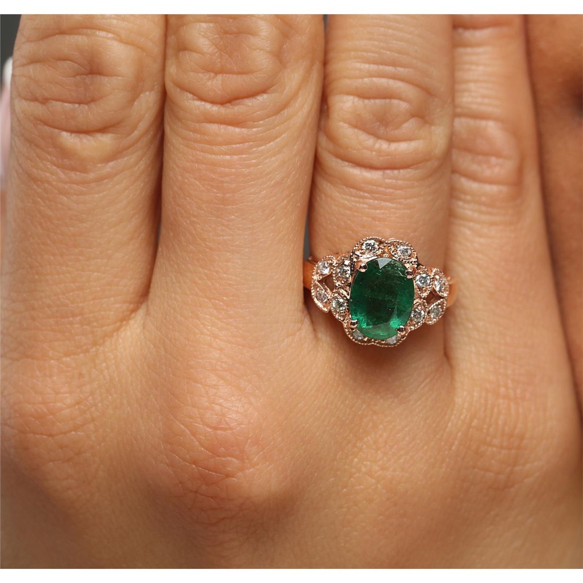 One ring featuring: 14KT rose gold weighing 6.10 grams containing one prong set oval cut emerald with a total weight of 2.36ct and pave set round cut diamonds with a total weight of 0.28cts.