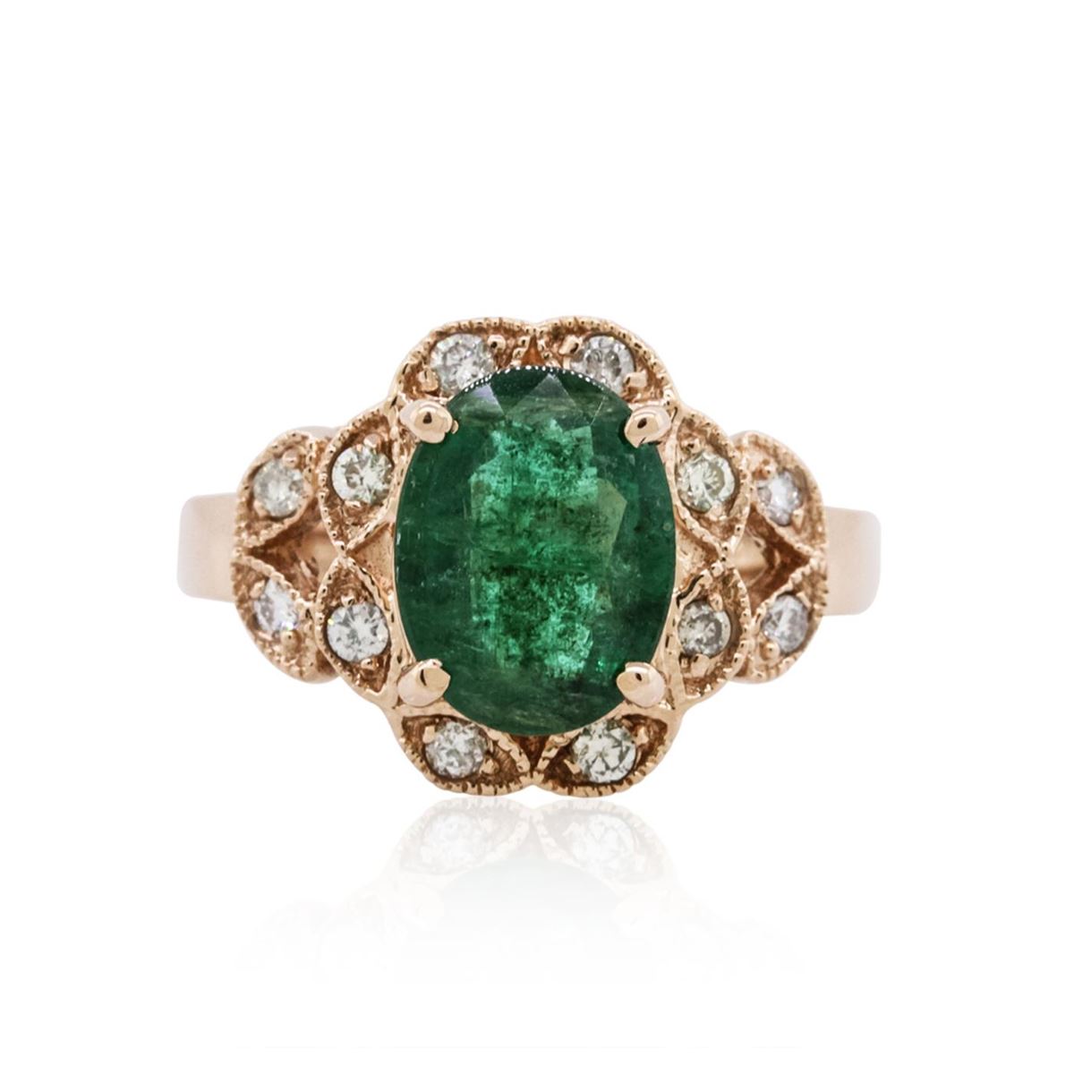 One ring featuring: 14KT rose gold weighing 6.10 grams containing one prong set oval cut emerald with a total weight of 2.36ct and pave set round cut diamonds with a total weight of 0.28cts.