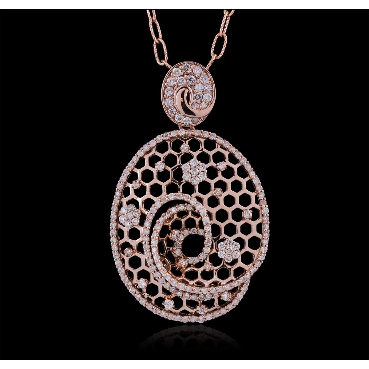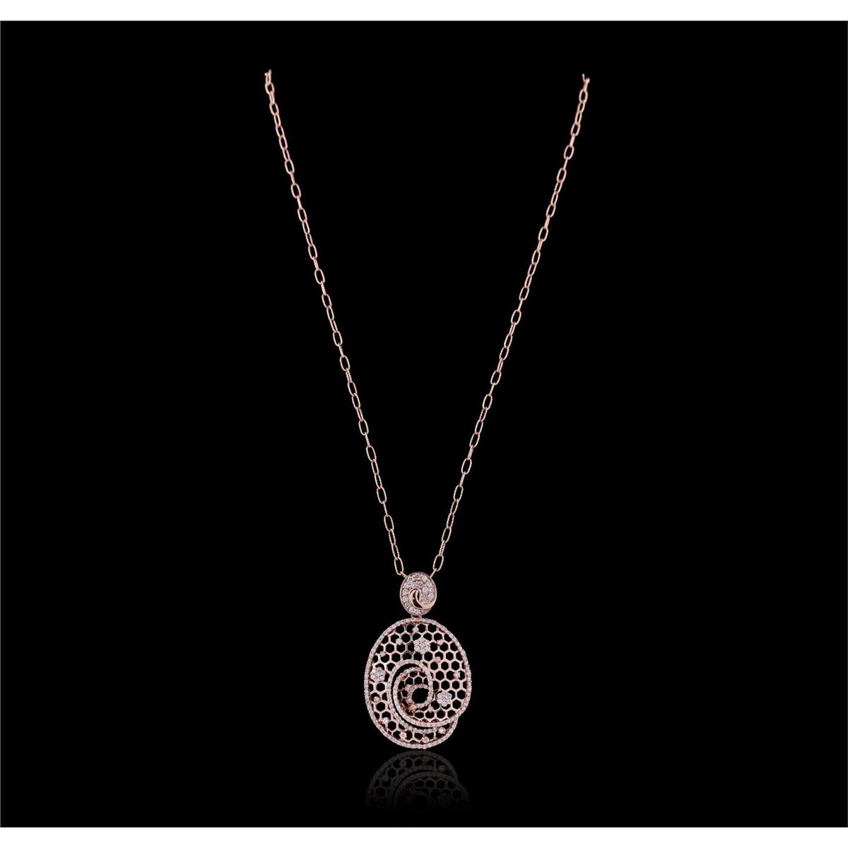 One electronically tested 14KT rose gold ladies cast & assembled diamond pendant with chain. The pendant is supported by an eighteen inch length 14KT rose gold designer style link chain, terminating in a lobster claw clasp. Bright polish finish. Identified with markings of "K14". Condition is new, good workmanship. Containing: One Hundred Eighty-Eight prong set round brilliant cut diamonds, measuring 1.70 - 1.30 x 0.90mm (depth est.) approximate total weight of 188 Stones = 2.41ct. Graded in the setting. Clarity: I-1 to I-3. Color: G - I. Total Weight of Diamonds 2.41ct. Total Weight of Pendant With Chain 13.43 grams. AIG Appraised at $7,705.00.