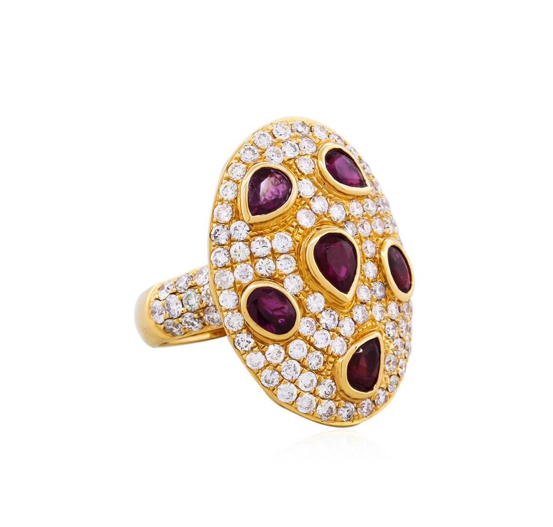 One ruby and diamond ring set in 14KT rose gold weighing 9.35 grams. This gorgeous ring contains six rubies with a total weight of 2.47 carat beautifully showcased by 2.32 carats of round diamonds which extend down both sides of the band.
