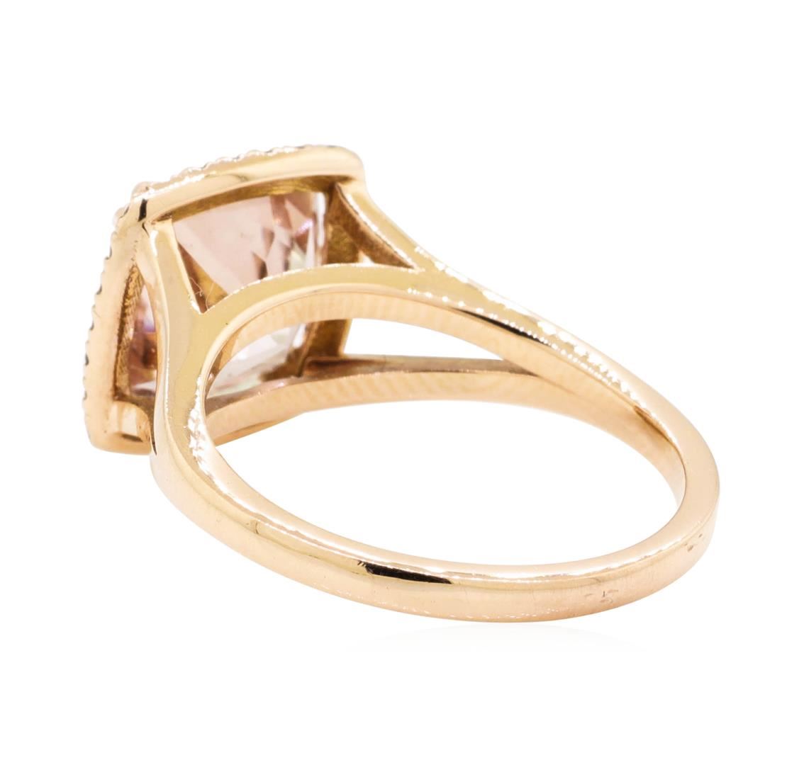 One Ladies ring featuring: 14KT rose gold weighing 3.9 grams containing one morganite center weighing 2.50ct and diamonds weighing 0.22ctw. The ring is a size 6.5.