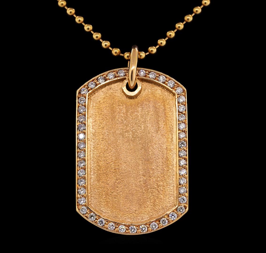 One electronically tested 14KT rose gold lady's combination cast & assembled fashion pendant & chain 22.0" long, 3mm round ball link with a lobster claw clasp with a bright polish and satin finish. The featured lady's pendant has a dog tag motif. Identified with markings of "14K 585". Condition is new, good workmanship. Containing: Forty-Six prong set round brilliant cut diamonds, measuring 2.50 - 2.35 x 1.51mm (depth est.) approximate total weight of 46 Stones = 2.50ct. Graded in the setting. Color H - I Clarity SI-1 to SI-2 Cut Good. Total Weight of Diamonds 2.50ct. Total Weight of Pendant & Chain 54.40gm. GAS Appraised.